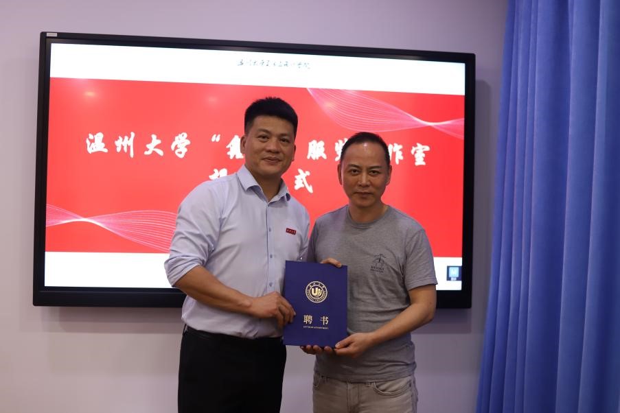 刘军董事长和叶正飞书记共同为3044am永利集团3044noc“鑫诺”服装工作室揭牌,叶正飞书记为刘军颁发创新创业导师聘书。