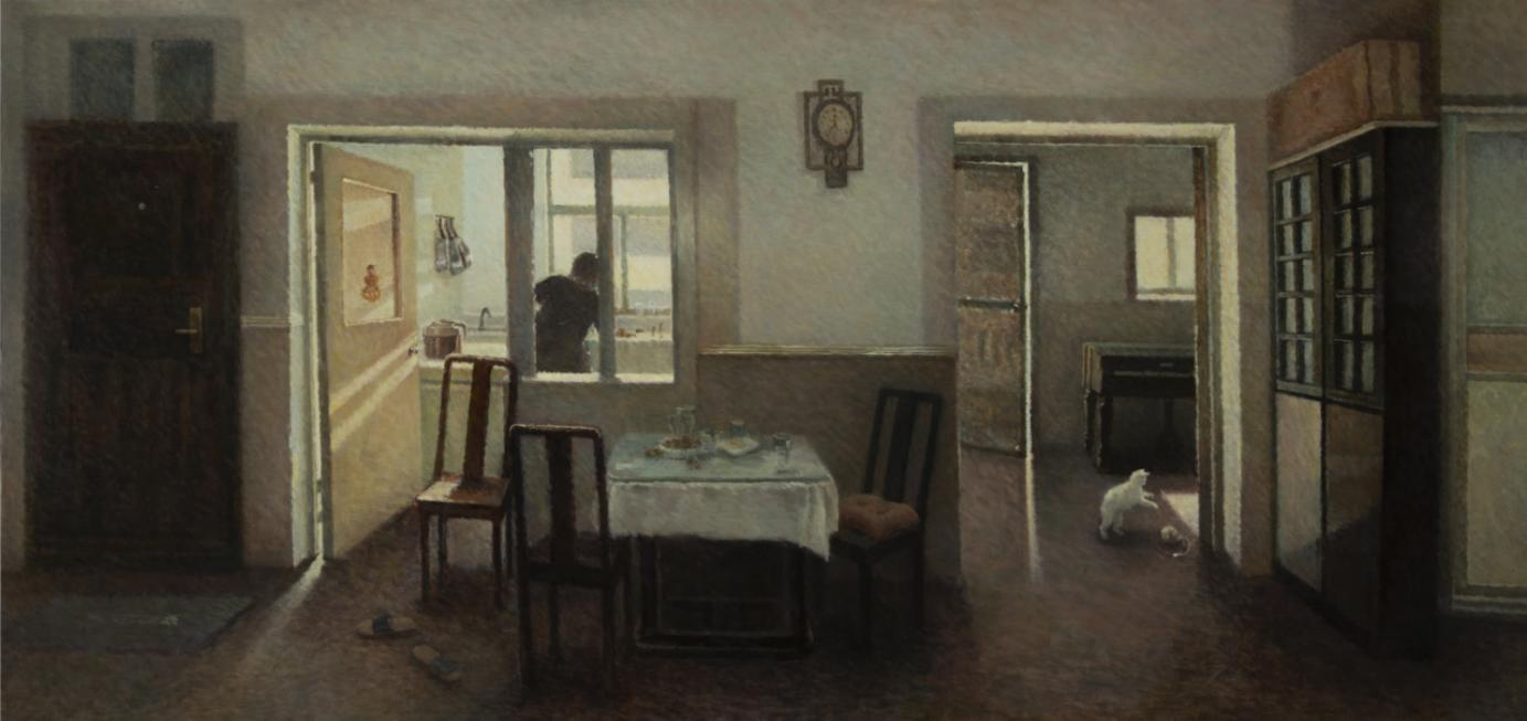 油画创作与研究方向的研究生王雅婕的作品《寂静的角落》,在室内空间中记录个人的生活经历与情感体验,表达静谧而温暖的情绪氛围,并在色彩与笔触的碰撞中,展现油画本身的语言魅力。她也是通过对哈默修依作品的学习与研究,形成了自己的语言风格。