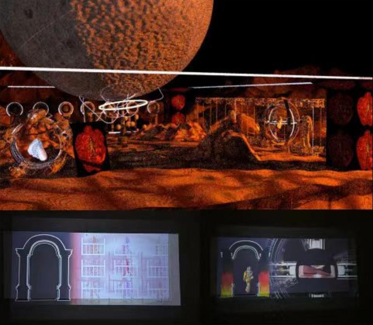 方晨同学将数字媒体投影技术与展示设计艺术相结合,带来了毕业作品《宇间迷梦》。从古老的嫦娥奔月想到万户飞天,再从运载火箭升空想到空间站和火星,科技的进步让人类敢于闯出更广大的未来,作品借助数字媒体投影技术,在展览中以各种动态数字艺术画面代替传统的静态画面,引入数字化、虚拟化、智能化的展示新模式,更加注重体验感和氛围感的营造。