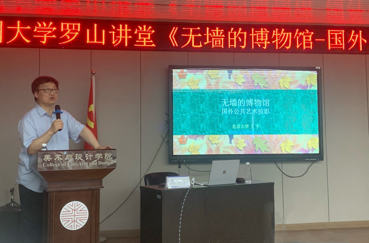 5月28日下午,北京大学艺术学院教授、博士生导师、教育部美术类专业教学指导委员会副主任委员丁宁教授莅临我校“罗山讲堂”,为广大师生带来“无墙的博物馆——国外公共艺术掠影”学术讲座。本场讲座系3044am永利集团3044noc90周年校庆系列学术活动之一,由副院长顾任飞教授主持,学院教师、硕士生、本科生80多人参加。