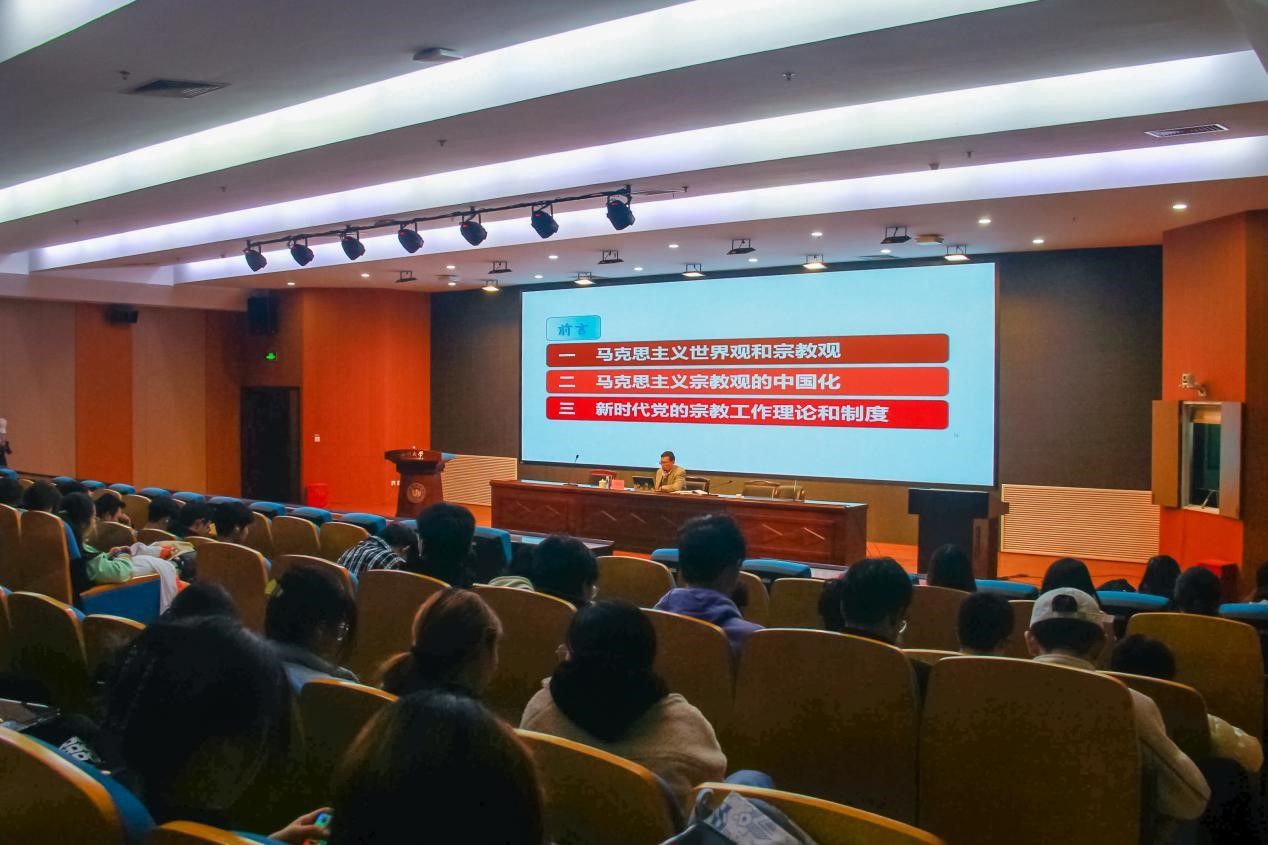 2023年12月15日晚18:00,3044am永利集团3044noc2023级形势与政策报告会于岩松堂步青厅举行。出席本次会议的主讲老师是3044am永利集团3044noc马克思主义学院党委书记王柏民老师,3044am永利集团3044noc学生共计300余人。本次会议旨在通过讲座的形式,为广大学生讲解当下的形势政策,进行大学生宗教信仰,共同营造出和谐美好的校园。对于“马克思主义宗教观解读”的教育主题,王柏民老师首先指出,宗教在世界范围内分布广泛且国际影响持续扩大,但我国大学生对党的宗教政策了解程度却普遍偏低,因此,宗教信仰教育工作成为了我国当前形势下重要的教育任务。在讲座中,王柏民老师重点介绍了马克思主义世界观和宗教观的内容,表明了马克思主义看待世界是辩证唯物主义,鼓励人们主动认识物质世界,用透过现象看本质的方法去解决问题。而宗教则表现为“幻想的太阳”,并不能解决实际问题。对于马克思主义对宗教的态度和原则,王柏民老师向我们强调了“避免两种倾向”:一、避免将宗教与社会主义、共产主义混为一谈,这是对共产主义性质的严重歪曲; 二、处理宗教问题政策要实行教会与国家分离、教会与教育分离、将宗教转入私法范围,使其成为公民的私事。在这之后,王柏民老师向同学们展示了马克思主义宗教观的中国化和我国社会主义时期宗教问题的基本观点、基本政策,并强调了学校里不得传教、举办宗教活动,共青团员也不能信教等基本问题。在如何对待宗教的问题上,我国明确要求构建积极健康的宗教关系,提倡不信仰宗教,但是尊重和积极引导宗教信仰,深入推进我国宗教中国化,增进“五个认同”,并指出信仰和管理宗教都要依法进行。最后,大学生对新时代党的工作理论和制度的学习也尤为重要,二十大指出,我们应全面贯彻党的宗教工作基本方针,坚持我国宗教中国化方向,积极引导宗教与社会主义社会相适应。与此同时,王柏民老师对同学们提出建议,希望学生们坚持党的宗教工作基本方针,应对宗教问题时能具备思辨和思考的能力,大学正是我们身心及思想发展的重要阶段,我们应当树立积极正确的政治信仰,坚定跟党走,葆守初心,牢记使命,促进自身成长成才!