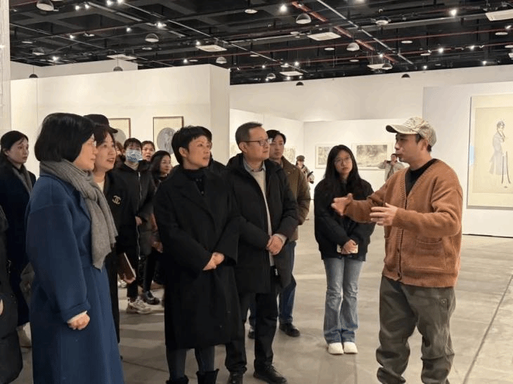 开幕式结束后,本次展览策展人梁腾为各位领导嘉宾做现场导览。
