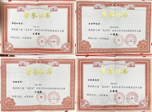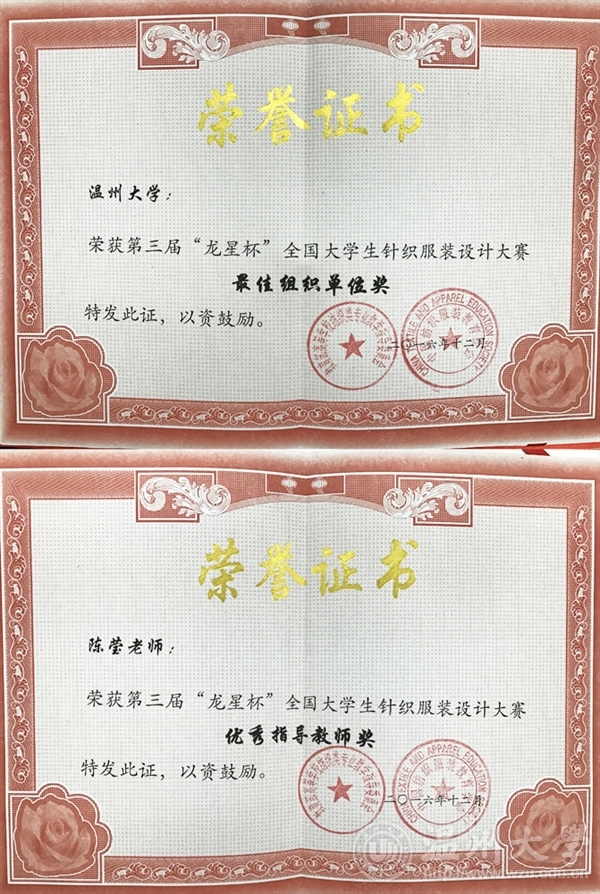 2016年12月30日,由教育部高等学校纺织类专业教学指导委员会和中国纺织服装教育学会主办的第三届“龙星杯”全国大学生针织服装设计大赛,颁奖典礼在东华大学举行。永利集团官网服装专业学子在赛事中斩获包括一、二等奖在内的六个奖项,3044am永利集团3044noc获优秀组织奖,陈莹老师获优秀指导教师。