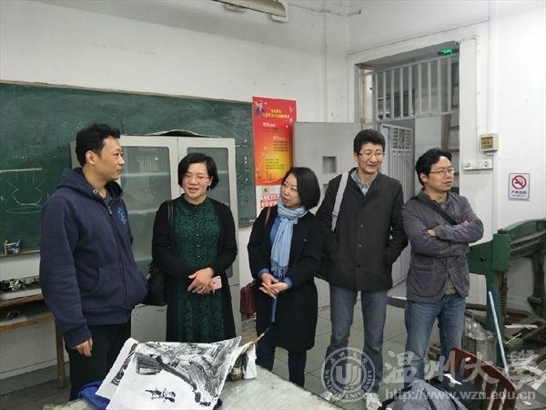 4月11日上午10:00,永利集团官网教学副院长谢子静、美术系主任陈旭海、理论教研室主任胡建南、油画教研室主任丁海涵、国画教研室主任楼晓勉、教学科副科长邹青等老师来到位于金华市的浙江师范大学美术学院教学交流,该院院长邱兴雄和教学副院长施俊天、美术学系王琴主任、朱教授接待了我们。 邱院长和永利集团官网谢子静副院长就美术学师范专业办学历史、办学理念、办学特点及美术学工作室建设等方面进行了深入的交流。教学副院长施俊天等负责人向我们详细介绍了版画、水彩、油画、国画、书法等专业方向的课程设置、工作室分类建设、师范生就业等具体情况,和我们进行了深入的交流和探讨。 下午,我们在该院尹小斌教授、薛磊老师等专业教师的陪同下冒雨参观了版画、水彩、国画、油画、书法等专业工作室。