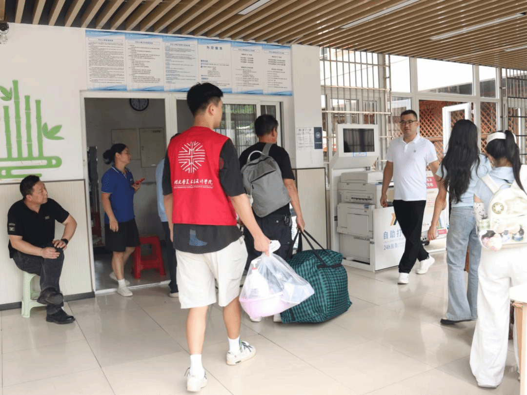 清晨伊始,学院报到点人头攒动,温馨有序。一抹抹忙碌的“志愿红”构成了校园里最亮丽的风景线。由学院党员和学生骨干组成的志愿者团队,以高度的责任感和亲切的笑容,穿梭于迎新一线。他们耐心细致地引导新生办理各项入学手续,主动帮忙搬运行李,提供校园学习生活咨询,为新生和家长拍照留影等,用实际行动诠释了“奉献、友爱、互助、进步”的志愿精神,让初来乍到的新生和家长们感受到了美术学院大家庭的温暖与关怀。