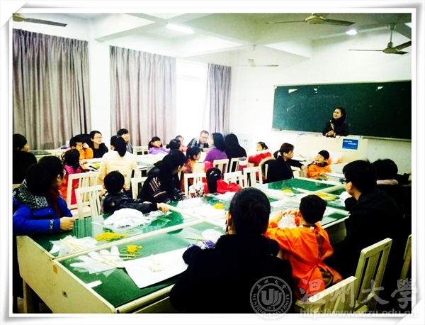接着,仁老师主要讲述了制作工序以及期间需要注意的问题。之后,孩子家长们就投入到实践中,谨慎地设计,小心地穿线,打结,褶皱,全心全意。不久后,陆陆续续的完成了“扎”,接着便是“染”的环节了。家长和孩子们将准备好的围巾,浸泡并且进行染色。经过一段时间的等待,在拆线解绑的瞬间,家长和孩子们都露出了欣慰的笑容,都赢得了满座的夸赞。