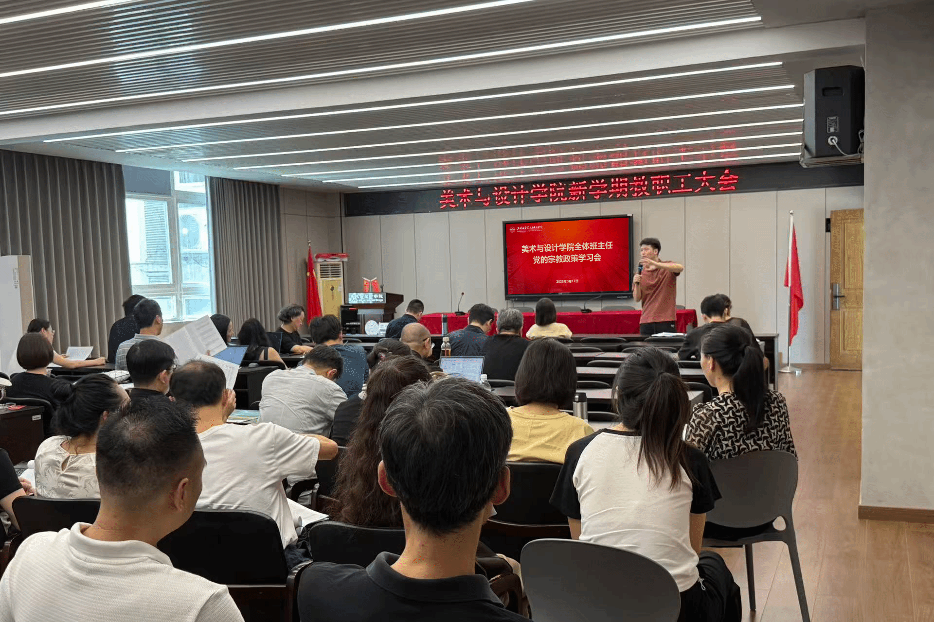 会议首先由学工办副主任杨永利带领全体班主任学习党的宗教政策。他重点解读了我国宗教工作的基本方针和政策法规,要求班主任积极引导学生树立正确的世界观和人生观,以便更好地开展学生思想政治教育工作。随后由各年级辅导员围绕学生心理健康教育、防诈骗、交通安全、学风建设、考研就业、公寓安全管理以及学科竞赛组织动员等方面进行了讲解和分享。