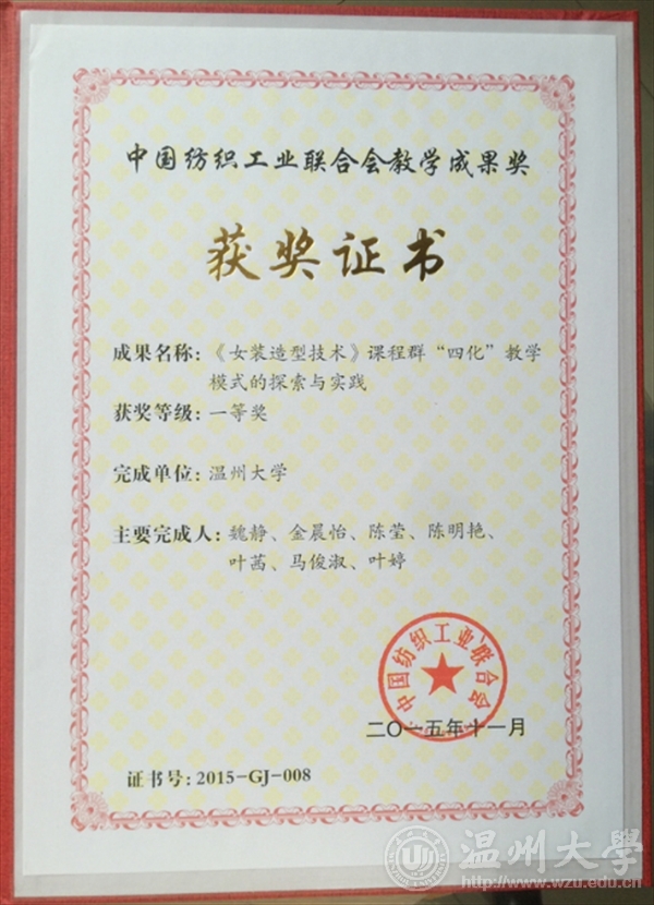 2015年11月24日,“纺织之光”2015年度中国纺织工业联合会科技教育奖励大会在北京人民大会堂隆重举行。中国纺织工业联合会、各专业协会领导,地方行业协会领导,纺织之光科技教育基金会理事以及本次会议表彰的科技工作者、企业家、院校教师与学生获奖代表及媒体嘉宾600余人出席了大会。永利集团官网魏静教授应邀出席了会议。 纺织之光2015年度中国纺织工业联合会表彰了科学技术奖、教育教学成果奖、教师特别奖、学生特别奖、创新奖、行业技术能手荣誉称号、行业技能人才培育突出贡献单位及个人。充分体现了中纺联对纺织行业科技教育工作的高度重视和对广大科技工作者、教育工作者、学生和一线技术工人的亲切关怀。希望全行业广大员工以获奖者为榜样,带动全行业创新创业的热潮,在攻坚克难中追求卓越,为建设纺织强国作出新的更大贡献。 永利集团官网魏静教授主持的《女装造型技术》课程群“四化”教学模式的探索与实践荣获2015纺织之光教学成果一等奖;陈明艳教授主持的依托区域产业的服装设计与工程专业卓越工程师人才培养模式的改革荣获二等奖。