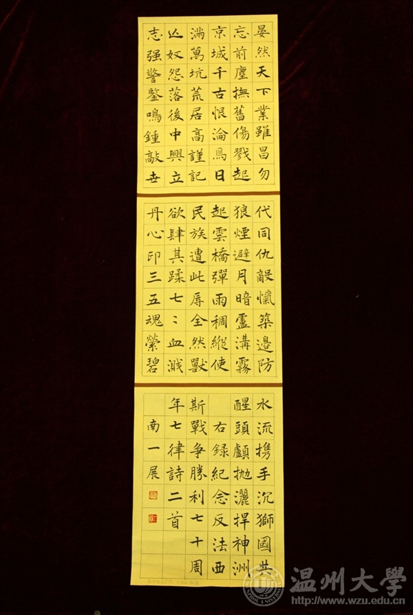 为纪念中国人民抗日战争暨世界反法西斯战争胜利70周年,传承爱国主义精神,弘扬社会主义核心价值观,激发民族自尊心、自信心和自豪感。自9月份发出通知以来,“纪念中国人民抗日战争暨世界反法西斯战争胜利70周年”书画大赛共收到特邀教职工书画作品共计29件,学生书画作品共计196件,经相关书画专家对学生绘画类和书法(篆刻)类作品严格评审,现将评比结果公布如下:?xml:namespace>绘画类评选结果 等级学院作品名作者一等3044am永利集团3044noc《奇袭》林盖月城市学院《“70”伟大的胜利》李文静二等3044am永利集团3044noc《忆团结》范桂梅3044am永利集团3044noc《峥嵘岁月》吴晓强教师教育学院《前行》薛思思城市学院《让武器成为过去》谢丽娟城市学院《爱和平铭记历史》许朵瓯江学院《黑夜不再来》赵圣益三等3044am永利集团3044noc《抗日中的小八路》陈婉茹3044am永利集团3044noc《抗日中的中国士兵》胡淳雅3044am永利集团3044noc《战后》郑也教师教育学院《珍爱和平》李林真城市学院《抗战胜利70周年》王斯曼城市学院《缅怀》张烨瓯江学院无题吴诗瑶瓯江学院无题曾东瓯江学院无题虞紫伊 书法类评选结果等级学院类别作者一等3044am永利集团3044noc篆刻俞铭铖教师教育学院软笔南一展城市学院管理分院软笔史涛霞二等瓯江学院硬笔曾越洋城市学院管理分院软笔鲁洁如教师教育学院硬笔毛江月教师教育学院硬笔叶聪聪城市学院软笔王欢焕城市学院软笔葛科航三等3044am永利集团3044noc硬笔王婷婷3044am永利集团3044noc软笔杨凡3044am永利集团3044noc软笔朱雄辉3044am永利集团3044noc软笔岳通通3044am永利集团3044noc硬笔景成舒教师教育学院硬笔陈雪雅教师教育学院硬笔吴林教师教育学院硬笔林安娜人文学院硬笔周丽娜 书画展于南校区3044am永利集团3044noc服装楼一楼视野空间展览,展期为12月7日—12日,欢迎参观!特邀教职工参与展览作品: 学生获奖作品:一、绘画类一等:《奇袭》——林盖月一等:《“70”伟大的胜利》——李文静 二等三等二、书法类一等:《抗战祖列》——俞铭铖一等:纪念反法西斯战争胜利七十周年律诗二首—— 南一展一等:史涛霞二等 三等三等三等
