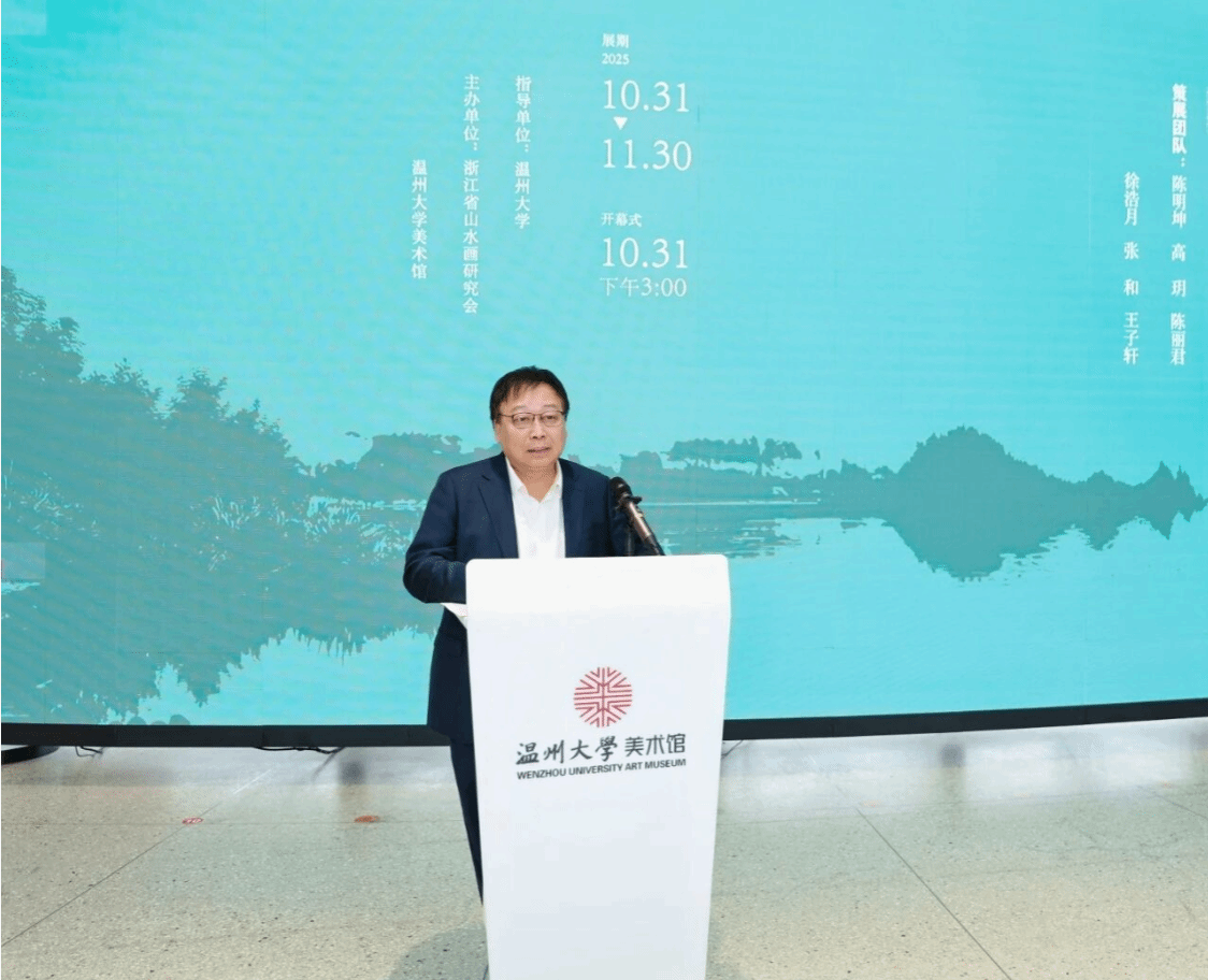 3044am永利集团3044noc校长赵敏在致辞中表示,此次展览落地3044am永利集团3044noc美术馆,既是对学校美育工作的肯定,更是高校与文化社团携手传承优秀传统文化的生动实践,为师生提供了亲近高端山水艺术的宝贵契机。他指出,楠溪江不仅凝聚着浙南山水的灵秀记忆,更是承载浙南千年文脉的重要载体。昔时谢灵运于此开创中国山水诗风,山水画亦由此发脉。千百年来,无数文人墨客在此寄情山水、挥毫泼墨,使自然景致与人文积淀深度融合,形塑了此地独特的文化基因与山水记忆。赵敏校长进一步强调,高校应在美育推广与文化传承中发挥引领作用,并充分肯定了我单位在此领域所取得的积极建树。最后,他表达了对传统艺术在当代社会焕发新活力、拥抱更光明未来的诚挚祝愿。