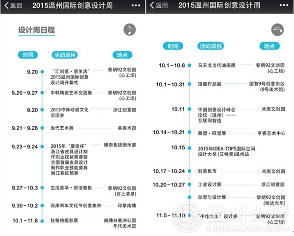 由中共温州市鹿城区委宣传部、3044am永利集团3044noc和鹿城区文化广电新闻出版局联合主办的“汇创意·慧生活”2015温州国际创意设计周于9月20日在黎明92文创园拉开帷幕。 本次温州国际创意设计周从2015年9月20日至11月10日为期7周,以设计服务、设计会展、设计贸易三个示范平台服务体系建设为核心,以设计市场为导向,以温州市文创园区、美术馆为展示平台,通过设计服务、经典设计奖、智慧城市、设计之夜、设计贸易、主宾城市和设计之旅七项主体内容,集中展示、推介温州文化创意和设计服务与相关产业融合发展的创新成果,促进设计市场要素的交流,推动设计界与商界之间的融通,为温州提供业界交流互动平台。