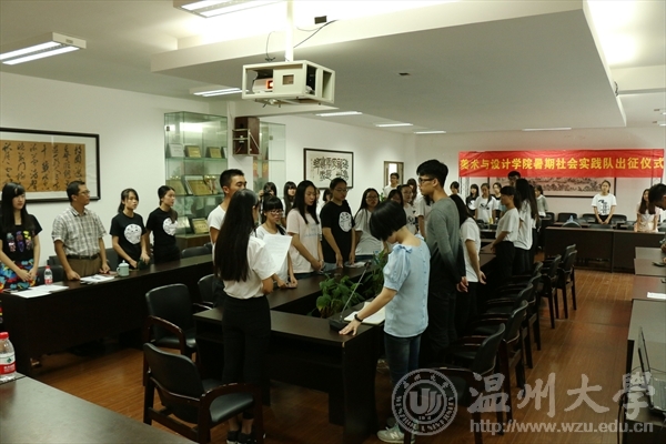 7月7日上午,3044am永利集团3044noc3044am永利集团3044noc2015年暑期社会实践出征仪式在美术楼2B4001举行。永利集团官网党总支副书记杨振海、学生科科长叶筱卉、实践队指导老师叶婷、辅导员李燕艳及3044am永利集团3044noc九支实践队的队长和队员们出席了出征仪式。由叶筱卉老师主持仪式。学生科科长叶筱卉首先对2014年的实践工作及成果做了汇报总结,并介绍了永利集团官网9支暑期社会实践队队伍基本情况及注意事项。 杨振海副书记对本次实践活动进行部署并提出具体要求。她指出:一、要明确大学生暑期社会实践的重要性和必要性;二、要注重安全实践的意识,安全第一,每天至少两次汇报实践队情况;三、要做好实践材料的收集和整理,为后期评比做好准备。 叶婷老师作为指导老师代表发言,提醒全体队员,务必服从组织安排,做好防暑和安全工作,让社会实践活动在安全的前提下顺利、有效的进行。并寄语美院实践取得优良成绩。紧接着,各实践队队长分别进行各自的实践特色风采展示并宣誓。杨振海副书记为实践队代表授旗。最后在:“社会实践,我们准备好了!”的嘹亮口号中,此次暑期社会实践出征仪式圆满完成。2015年美术与设计学院暑期社会实践的号角已经吹响,美院学子们将以青年人特有的朝气和蓬勃,带来的是一场关于青春的盛宴,精彩还在继续,敬请期待。