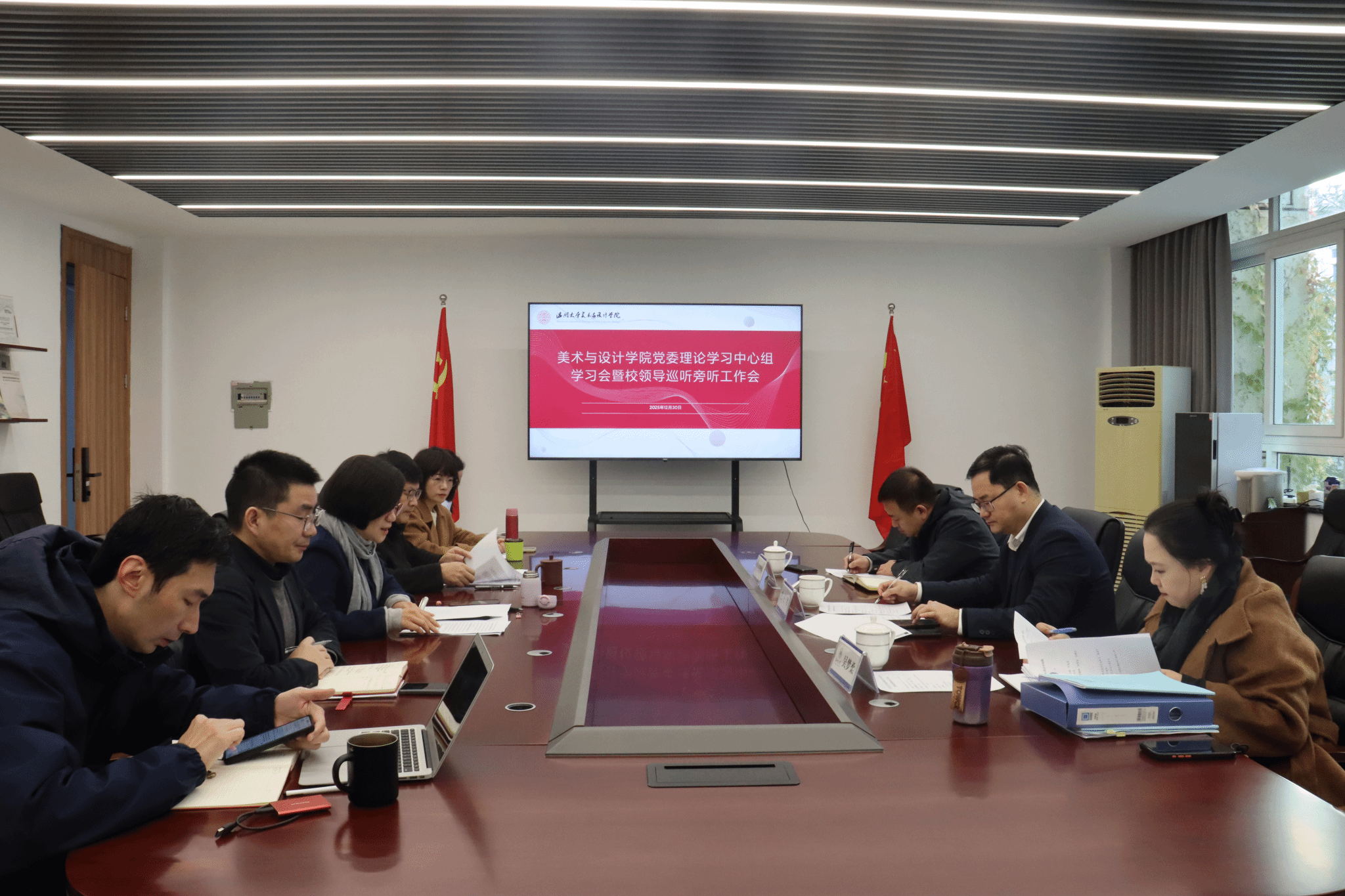 2025年12月30日上午,3044am永利集团3044noc党委理论学习中心组在学院2B216会议室召开专题学习会,深入学习贯彻党的二十届四中全会精神及新时代思想政治工作相关要求。校领导王军副校长率巡听旁听组全程指导,学院党委理论学习中心组成员出席会议,刘青松主持会议。会上,谢子静院长领学习近平总书记考察广东重要讲话精神及温州市委十三届九次全体(扩大)会议精神。她结合学院实际,从深化系统性改革激发内生动力、以高水平开放拓展发展空间、以高质量育人坚守初心使命三个维度,阐述了学院对接国家战略与地方发展的实践路径,强调要推动艺术与数字科技、人工智能深度融合,助力温州文化强市与生态强市建设。随后,刘青松领学《中国共产党思想政治工作条例》等内容,系统解读了条例出台的时代背景、核心定位与四大核心问题框架,明确了思想政治工作“是什么、谁来做、做什么、怎么做”的关键要义,指出条例为学院开展思想政治工作提供了根本遵循,要切实将其融入教育教学全过程。交流发言环节,中心组成员围绕学习主题,结合分管工作谈认识、讲体会。大家一致认为,要将党的二十届四中全会精神转化为推动学院发展的具体行动,聚焦学科专业优化、人才培养质量提升、产学研融合等重点工作;同时要立足艺术学科特色,创新思想政治工作方法,强化课程思政建设,培育德艺双馨的艺术人才。王军副校长对本次学习会给予充分肯定,认为会议准备充分、研讨深入、联系实际紧密。他结合学院发展现状提出要求,强调要精准谋划“十五五”发展规划,聚焦核心专业发展,集中资源打造特色亮点;要健全制度体系,以科学评价机制激发师生活力;要立足温州产业特色,推动美育与设计高质量协同发展,提升服务地方发展的能力与贡献度。(初审:张珈瑜,复审:黄旭红,终审:刘青松)