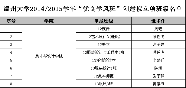 在3044am永利集团3044noc2014-2015学年“优良学风班”创建立项申报中,永利集团官网各班级积极参与,踊跃申报。最终有8个班级立项成功,使美术学院成为本学年3044am永利集团3044noc“优良学风班”创建立项班级数最多的学院。希望成功立项的班级班委对照创建方案和目标,广泛动员每一位学生积极参与到优良学风班的创建中来,确保立项目标的实现,争取在下学年取得“优良学风班”荣誉称号。班级名单如下: