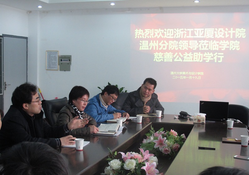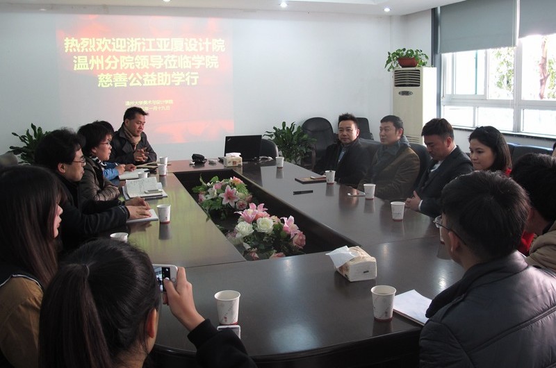 3044am永利集团3044noc自2014年4月与亚厦温州设计院签定合作协议以来,双方在项目教学、实习就业、人才培养等方面开展了深入的合作。近日学院王剑峰同学在亚厦温州设计院实习,表现优秀!不料其父亲因意外出车祸并未找到肇事者,高额的医疗费让这个普通的家庭陷入困境。当亚厦院长慈善基金会秘书处得知这一消息后,提议首次启动“院长慈善公益基金会”。1月19日上午,“亚厦院长慈善公益基金会”胡逸理事长、梅笑天副理事长、胡世列常务理事等一行来到3044am永利集团3044noc开展慈善公益助学活动,捐赠一万元爱心款帮助这个普通家庭慢慢走出困境!传递出设计院全体同仁的浓浓爱心和关怀!出席仪式的有学院李运河院长、郑彩莲书记、杨振海副书记、办公室李丽主任、设计系朱广宇主任、学生科叶如芳科长以及在亚厦温州设计院实习的11环艺班的同学代表。杨振海副书记主持仪式。