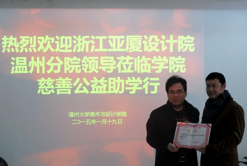 3044am永利集团3044noc自2014年4月与亚厦温州设计院签定合作协议以来,双方在项目教学、实习就业、人才培养等方面开展了深入的合作。近日学院王剑峰同学在亚厦温州设计院实习,表现优秀!不料其父亲因意外出车祸并未找到肇事者,高额的医疗费让这个普通的家庭陷入困境。当亚厦院长慈善基金会秘书处得知这一消息后,提议首次启动“院长慈善公益基金会”。1月19日上午,“亚厦院长慈善公益基金会”胡逸理事长、梅笑天副理事长、胡世列常务理事等一行来到3044am永利集团3044noc开展慈善公益助学活动,捐赠一万元爱心款帮助这个普通家庭慢慢走出困境!传递出设计院全体同仁的浓浓爱心和关怀!出席仪式的有学院李运河院长、郑彩莲书记、杨振海副书记、办公室李丽主任、设计系朱广宇主任、学生科叶如芳科长以及在亚厦温州设计院实习的11环艺班的同学代表。杨振海副书记主持仪式。首先,杨振海副书记对出席此次慈善公益助学的亚厦温州设计院领导一行表示感谢。随后设计系朱广宇主任就亚厦项目进课堂做了介绍,他提到这个教学改革能帮助大学生的课堂与实习就业对接,使学生毕业后能更好地走上就业岗位。而亚厦作为设计界的一位领头军,也非常重视后备力量的培养,学院很多学生走进亚厦,在胡逸院长等很多老师和设计届精英的带领下,进入各个分院或设计工作室进行学习深造,最后也有不少学生在实习结束后正式加入亚厦工作。在亚厦温州设计院实习的11环艺班的同学代表也作了实习感想发言,有同学说,亚厦是一个温暖的家庭,同事间融洽互助;有同学说亚厦的工作环境舒逸,但工作严谨,让人学到很多知识和技能;也有同学说亚厦是一个真诚的大家庭,希望能一直在这样的氛围里工作实习……接着,亚厦温州设计院胡逸院长代表设计院也作了发言,他说,亚厦温州设计院与3044am永利集团3044noc有着深厚的渊源,这一次的慈善公益助学行不仅仅是慈善活动,更像是一次年终的成果汇报。亚厦一直重视企业文化的建设和互补性资源的开发利用,秉着“做有文化的生意,做力所能及的事”,传递企业文化中的正能量,推动公益事业的发展,做室内设计业的标杆。最后,郑彩莲书记在听取相关发言后做了总结,她说:“我们深刻感受到亚厦企业文化和美院课堂文化的融合,几个项目的开展推进,展现了双方战略意识的生动合作,也填补了学生在实习就业方面的经验,特别是增加了学生在现场项目的参与度和实践工作的经验值,也希望亚厦温州设计院和3044am永利集团3044noc继往开来,开设更多的第二课堂。” 李运河院长也作了感谢发言,他提议双方在2015年开展校企领域的跨界合作,并敦聘设计院梅笑天执行院长为学院客座教授。 一方有难,八方支援!同样值得赞扬的是在亚厦温州设计院同批实习的其他同学得知了王剑峰同学的情况后,也积极发动班内同学伸出援助之手,筹集了几千元善款,给予同学关心与精神上的鼓励。