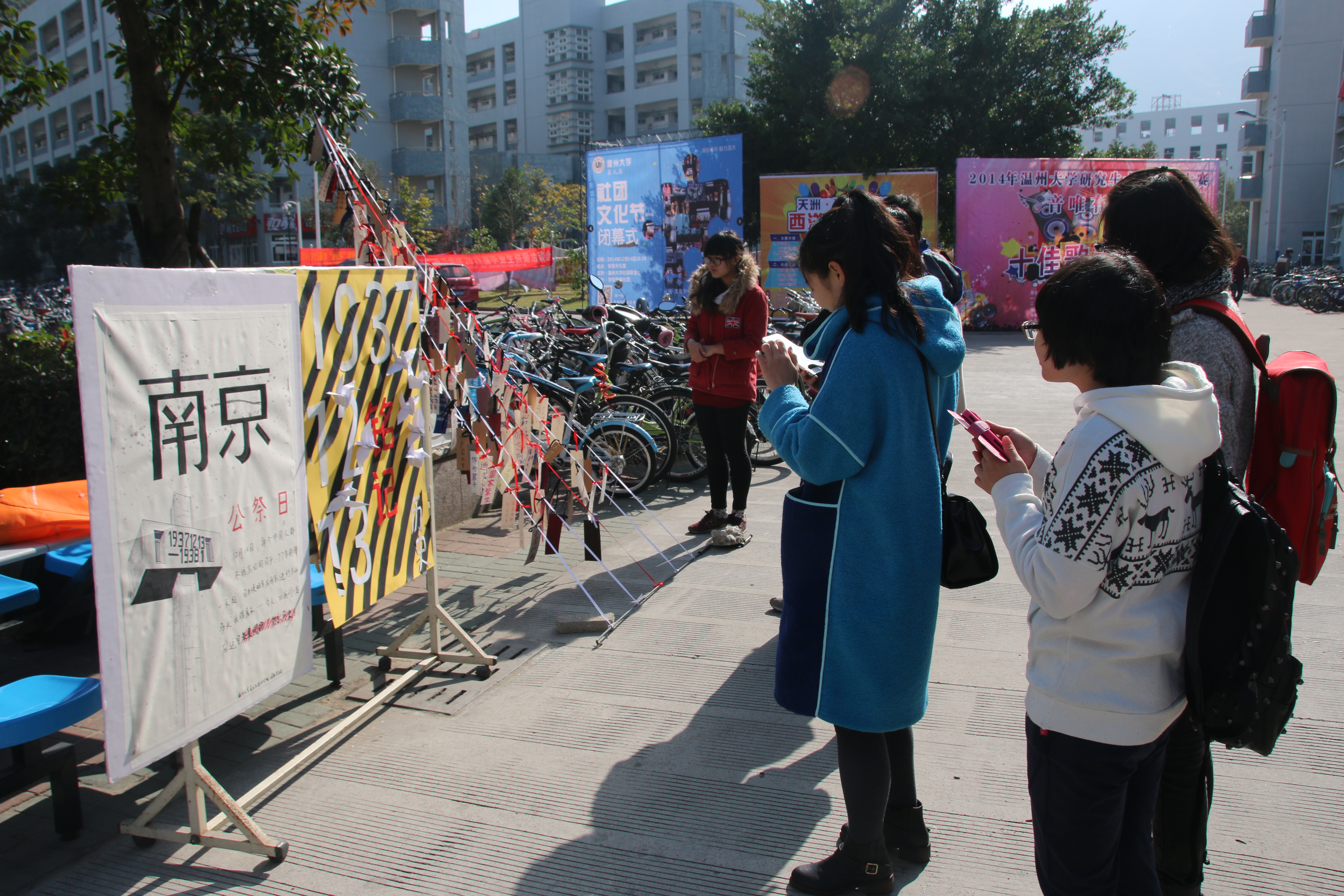12月13日当天,3044am永利集团3044noc团委学生会创业就业部与学风纪检部为响应本次国家公祭日,在超豪学区开展举办了祭语公祭悼念活动。本次活动展出了两张手绘悼念大海报及多张手绘宣传公祭漫画,同时开展了温大学子亲手写寄语、挂祭语活动。一同为南京大屠杀遇难人民哀悼,缅怀抗日先烈,勿忘国耻,铭记历史。 记住历史,但不要记住仇恨; 可以原谅,但绝不可以遗忘; 让白骨可以入睡,让冤魂能够安眠 把屠刀化铸警钟,把逝名刻作史鉴; 让孩童不再惊恐,让母亲不再凄叹 让战争远离人类,让和平洒满人间; 让我们以国家的名义,祭奠死难同胞! (通讯员:沈宇烽,摄影:张昇)