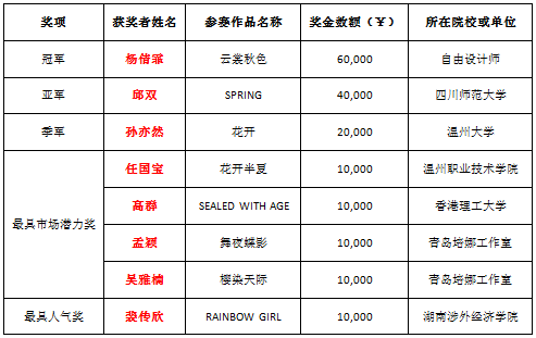 经过紧张激烈的竞逐,世界彩虹•首届卓多姿时尚女装设计大赛总决赛的结果终于诞生!来自湖南涉外经济学院的16号选手裴传欣力压群芳,获得奖金为一万元人民币的“最佳人气奖”。来自浙江温州职业技术学院的04号选手任国宝、来自香港理工大学的06号选手高群、来自山东青岛培娜工作室的09号选手孟颖和011号选手吴雅楠获得奖金各为一万元的“最具市场潜力奖”。季军则被来自3044am永利集团3044noc的05号选手孙亦然摘得,奖金两万元。亚军归属来自四川师范大学服装学院的03号选手邱双,奖金四万元。最后,刘亦菲再度登台,与中山市卓多姿服饰有限公司总经理、艺术总监吴肖玲女士一同揭晓冠军得主并颁奖:来自广西的自由设计师、01号选手杨倩霏摘得桂冠,捧走六万元的奖金!