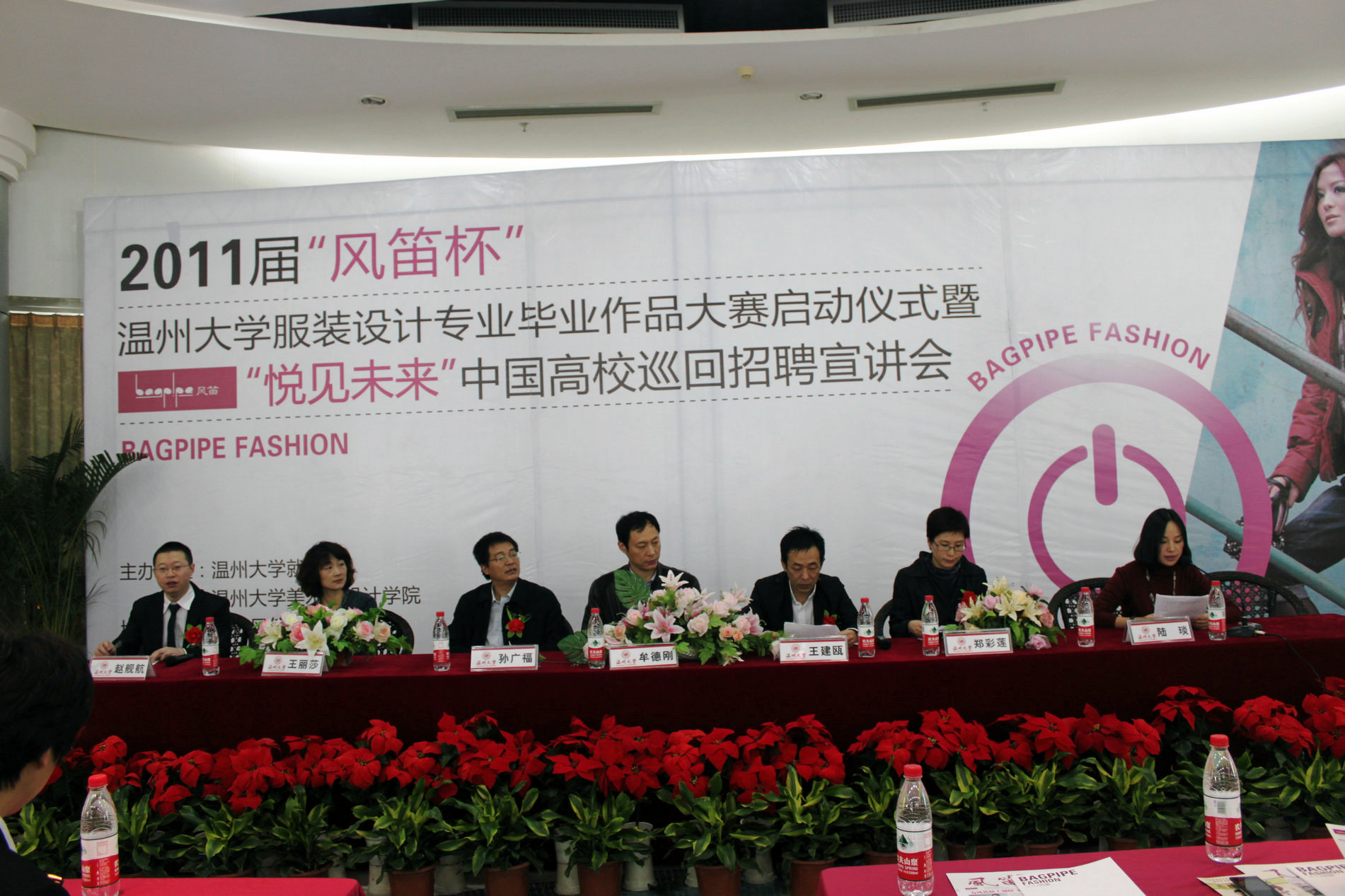 2010年11月21日上午九点,由3044am永利集团3044noc就业处和3044am永利集团3044noc联合主办的2011届“风笛杯”3044am永利集团3044noc服装设计毕业作品大赛启动仪式暨“悦见未来”中国高校巡回招聘宣讲会,在大学生活动中心茶吧隆重举行。3044am永利集团3044noc党委副书记牟德刚、3044am永利集团3044noc就业工作处处长孙广福、3044am永利集团3044noc党总支书记郑彩莲、浙江风笛服饰有限公司总经理王建瓯、首席设计师王丽莎、人资中心总监赵舰航出席了启动仪式,会议由3044am永利集团3044noc服装设计教研室主任陆琰主持。参加本次活动的还有3044am永利集团3044noc全体服装系学生。