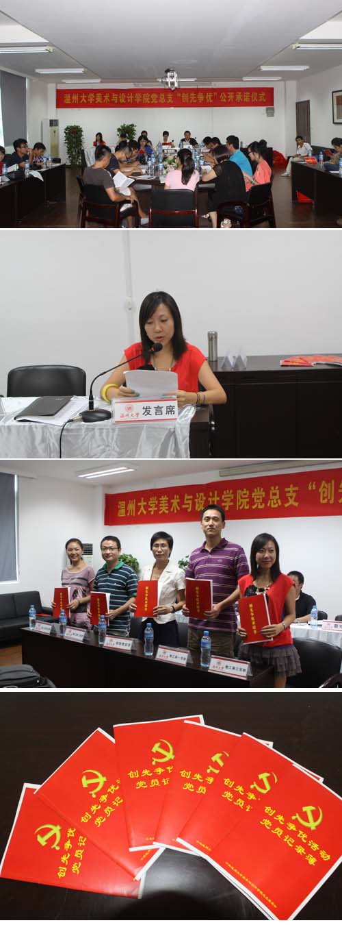 “我代表教工第一党支部在创先争优活动中作如下承诺:爱岗敬业,具有高度的责任观念。上课前认真备课,努力上好每一堂课,课后认真批改作业,尽心尽责地完成本职工作……”; “作为绘画基础支部,我们在科研、创作上保持于时具进的精神,提高自主创新的能力,积极申报课题,并努力创作出符合时代需求的艺术作品……” 9月21日,3044am永利集团3044noc党总支在2B4001会议室举行教工党员公开承诺仪式。学院党总支委员及全体教工党员参加了仪式。仪式由学院党总支副书记朱启鑫主持。朱启鑫在仪式上传达了总支创先争优活动推进会的会议精神,并宣读了《3044am永利集团3044noc党总支创先争优活动方案》。副院长李运河代表学院党总支宣读了总支承诺,随后,各教工支部书记代表各支部作公开承诺并在承诺书上签字。 仪式上,各支部的承诺充分体现了“争当岗位奉献标兵”、“创温大艺术先锋团队”、“亮牌示范争做育人成长表率”和“争当思政工作标兵”等内容。活动过程中,各教工支部从支部的工作实际出发,各具特点,确保了公开承诺不摆花架子、不走过场。在公开承诺前,各教工支部应学院发展和学生成长之所需、所急、所盼,将讨论意见进行汇总,力求承诺事项落到实处。 学院党总支书记郑彩莲郑作总结。她首先明确了创先争优活动的内涵和重要意义,希望通过公开承诺,接受群众监督,以提高教工党员的责任感和使命感。她要求各教工支部以总支的七大主题活动为纲,理清各支部创先争优活动的工作思路,把基础工作和创新工作相结合,深入扎实的开展创先争优活动,为学院的又快又好发展注入活力。 据悉,在创先争优活动中,美术学院党总支将推行承诺六法,即明确承诺、严查承诺、公示承诺、履行承诺、监督承诺和评议承诺,要求全体教工党员晒承诺,接受群众监督。
