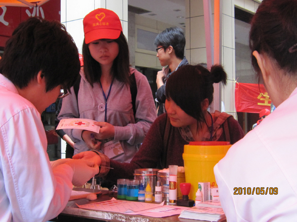 2010年5月9日,3044am永利集团3044noc“艺家人”青年志愿者协会联合温州医学院环境与公共卫生学院、温州职业技术学院及温州红十字会,在大学城商务中心开展了骨髓采样献血活动。活动现场,人群川流不息,献血车上排起了长长的队伍,同学们反应十分热烈。