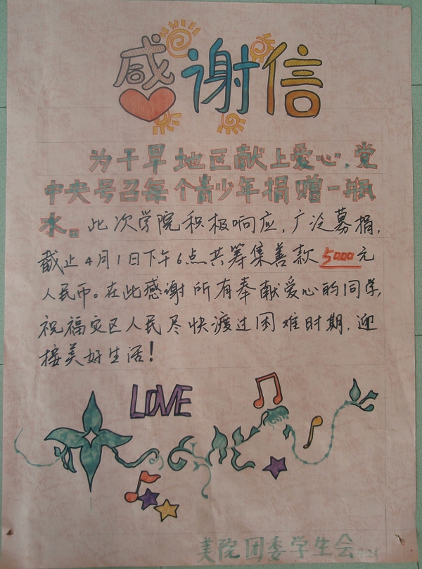 为响应共青团中央号召,弘扬“一方有难,八方支援”的中华民族传统美德,帮助西南灾区人民战胜灾害、顺利度过难关。4月1日上午,3044am永利集团3044noc团委学生会发起了“抗击干旱,你我同在——为西南灾区献爱心”活动,倡议全院同学为灾区献爱心。