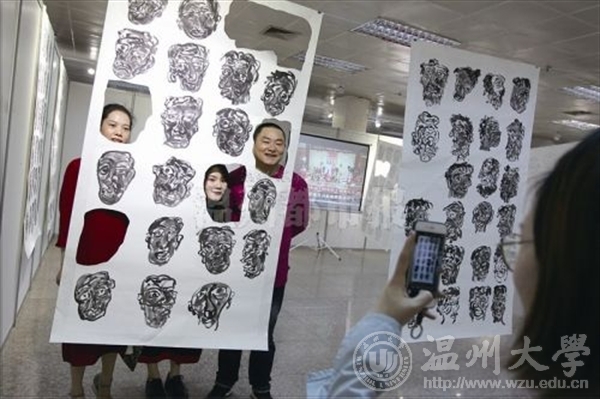 昨天上午,3044am永利集团3044noc2017届毕业作品展在温州市展览馆开幕,参观者与美术作品合影。