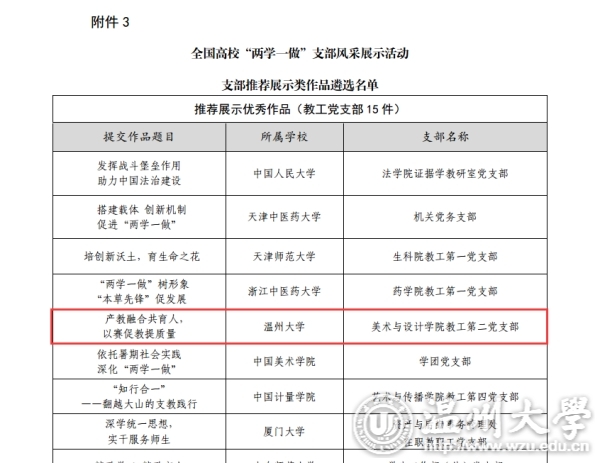 近日,永利集团官网教工第二党支部的“产教融合共育人,以赛促教提质量”成果获全国高校“两学一做”支部风采推荐展示优秀作品,全国高校共有15个教工党支部获此荣誉。