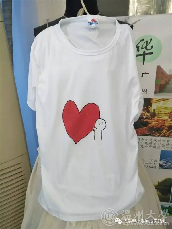 3044am永利集团3044noc大手牵小手实践队开始文化衫义卖咯! 在三垟湿地进行现场义卖: 一次文化衫的制作,远不只是一次绘画的过程,更是一场心灵的行程。 如花,不仅在素衣上留下了点点痕迹,更在我们的心间,留下浓墨重彩的丝丝痕迹,虽轻,但深。 作品展示: 湿地的荷叶开了满池塘应了那句诗接天莲叶无穷碧。由于湿地的改造 人儿不多 我们的义卖也遇到了瓶颈,不过我们并不会被打败!大手牵小手绘制的文化衫等待着他们的主人。 今天义卖的所得成果将全部捐给温州市红十字会,用我们的微薄之力帮助到真正需要帮助的人,用我们的行动感染社会上的人,关爱留守儿童和空巢老人,我们一直在行动!
