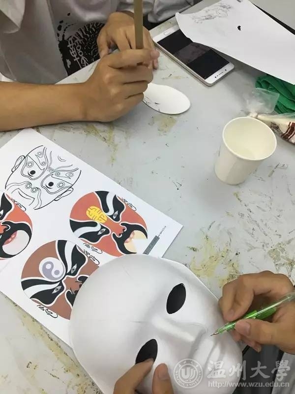 每个人都选择了自己喜欢的脸谱图案,在纯白面具上仔细涂抹,时而蹙眉时而微笑,时而换个角度端详作品。