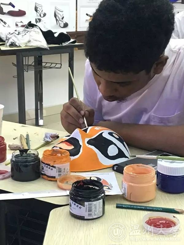 2017年7月8日,为了让更多的外国友人了解中国文化,“鞋蕴”暑期实践队邀请外国友人前来鞋靴实训中心104,参加“鞋蕴——中国传统文化”活动。中华文化博大精深源远流长,大家齐聚一堂以口交流以手实践,思维的碰撞中中华文化得以弘扬。 两位同学讲解中国的传统文化和京剧的历史传播,翻译官为外国友人翻译。外国友人听得津津乐道,受益匪浅,尤其对京剧脸谱方面特别感兴趣。 实践队全体成员与外国交流生共同绘制中国传统脸谱。脸谱极具有华夏民族特色,如红色象征忠义,不同类型的人物会有不同的谱式。 先用铅笔描绘整体的图案,结束后便是上色啦。五颜六色的颜料在空白的面具上闪闪发光,有些人大笔一挥初步轮廓便出来,有些人精工细琢一些细节。 每个人都选择了自己喜欢的脸谱图案,在纯白面具上仔细涂抹,时而蹙眉时而微笑,时而换个角度端详作品。 不一会儿,一个个精巧的脸谱便出来了。有红色脸的吴汉、关羽,有黑色脸的张飞、李逵,有白色脸曹操、严嵩,有黄色脸的典韦,有蓝色脸马武、窦尔墩,有紫色脸的徐延昭等等。 不只是脸谱,“鞋蕴”实践队美术专业的队员在绘制脸谱后绘制了书签,墨色的竹风雅至极。 亲手绘画脸谱更能体会到中国传统文化的韵味,过程中外国友人与队员们也多有交流,气氛十分融洽。在这次的活动中,我们收获的不仅仅只是对文化的了解,更加收获了一份珍贵的友谊。