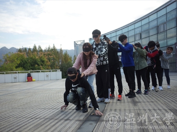 三四组同学的项目是贪吃蛇,两队除了蛇尾外的同学都带上了眼罩,在黑暗中,位于蛇头的同学在地上摸索着散落的木块,项目的关键就在于蛇尾同学的指挥和蛇身同学们的传达,一个协调的整体才能取得成功。