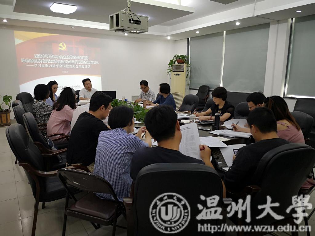 9月26日下午,3044am永利集团3044noc在2B216召开党总支中心组理论学习(扩大)会暨党务工作例会,传达学习习近平总书记2018年9月10日在全国教育大会上的讲话精神和省委教育工委副书记陈根芳同志在高校高知识群体中发展党员工作座谈会上的讲话精神。学院党政班子成员、总支委员、支部书记、系主任、各科、教研室主任以及研究生支部副书记参加学习。会议由学院党总支副书记杨振海主持。 李运河院长传达学习习近平全国教育大会重要讲话精神。李院长指出,习近平总书记的讲话强调教育是功在当代利在千秋的德政工程,是国之大计、党之大计;总书记围绕教育的根本问题“培养什么人、怎样培养人、为谁培养人”提出了教育改革要坚持党对教育事业的全面领导、坚持把立德树人作为根本任务、坚持优先发展教育事业、坚持社会主义办学方向、坚持扎根中国大地办教育、坚持以人民为中心办教育、坚持深化教育改革创新、坚持把服务中华民族伟大复兴作为教育的重要使命、坚持把教师队伍建设作为基础工作的“九个坚持”;习近平总书记还提出了教育方针的五个指导意见,一是要努力构建德智体美劳全面培养的教育体系,形成更高水平的人才培养体系;二是建设社会主义现代化强国,对教师队伍建设提出新的更高要求,也对全党全社会尊师重教提出新的更高要求;三是深化教育体制改革,健全立德树人落实机制,扭转不科学的教育评价导向,坚决克服唯分数、唯升学、唯文凭、唯论文、唯帽子的顽瘴痼疾,从根本上解决教育评价指挥棒问题;四是加强党对教育工作的全面领导,是办好教育的根本保证;五是办好教育事业,家庭、学校、政府、社会都有责任。 李院长结合教学经验强调,习近平总书记关于“培养什么人”的论述,有两个关键词:“德智体美劳”和“建设者和接班人”。纵观历史,每个国家都是按照自己的政治要求来培养人的,我国的社会主义教育就是要在党的坚强领导下,坚持中国特色社会主义发展道路,立足基本国情,坚持改革创新,在坚定理想信念、厚植安国主义情怀、加强品德修养、增长知识见识、培养奋斗精神、增强综合素质等六个方面下功夫,培养德智体美劳全面发展的社会主义建设者和接班人,办人民满意的教育。 张丽萍传达了省委教育工委副书记陈根芳同志在高校高知识群体中发展党员工作座谈会上的讲话和学校党务工作会议精神。张丽萍书记强调2018下半年学院总支工作总体要求是,以学习贯彻落实习近平新时代中国特色社会主义思想和党的十九大精神为主线,以夯实基层组织建设基础,提升组织凝聚力、战斗力为目标,以补齐短板、做强品牌、提升优势为要求,为推动人才培养质量提高提供坚强组织保证。 在理论学习会后,学院召开了总支委员会议,大家讨论并通过了“3044am永利集团3044noc党总支2018/2019上学期工作要点”,“3044am永利集团3044noc党建工作重点任务实施细则”。会议讨论了“学院十三五引进人才方案,增补谢子静副院长为总支委员,支部书记党务工作量核算办法,高知群体发展党员等具体事项。