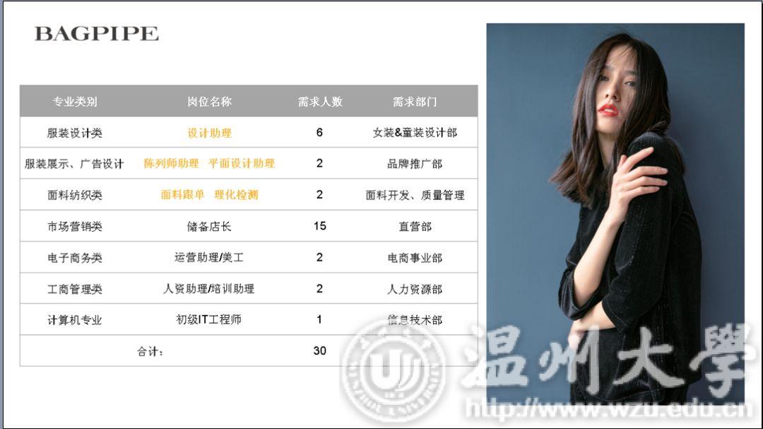“不忘初心,使命必达。”风笛宣讲人缪老师在分享风笛创始人创业史、发展史,讲述风笛的过去、现在与未来,同学们都听的津津有味。宣讲会在主持人和同学们的互动中开始后,主持人分别从公司品牌设计风格,员工的衣食住行娱,薪资问题和管培生培养计划等几个同学们关心的方面来介绍风笛服饰有限公司的细节。BAGPIPE风笛成立于1999年,是一家自主开发、生产、销售时尚女装和童装的品牌经营企业。风笛公司的女装品牌分为周末时尚,摩登帅气,精致优雅三个风格,而风笛公司的童装品牌的定位则是针对2-8周岁的儿童设计的,风格多样是风笛公司的优势所在。衣食住行方面,风笛公司也非常重视员工的感受,为他们提供了舒适的环境以便于员工们更好的工作和生活。同时,风笛公司也十分重视对人才的培养,也有一套完整的体系进行人才的引入。这便是风笛管培生培养计划的由来。对于进入风笛上班的应届生,风笛建立了完善的“管培生培养计划”,全面打造“一专多能”的复合型人才,让每个进入风笛的应届生迅速成长,成为独当一面的技术或管理人才。在经过由系统培训、店铺见习、核心轮岗和专岗实践四个环节的管培生培养计划之后,实习生便能更好地融入公司这个大集体。说到薪资方面的话题,风笛公司的PPT上有着这样一段话:“一个人,只有自己成长了,事业才会跟着成长。一个人,只有自身价值提升了,薪资岗位才能跟着提升。”从这段话中我们也可以清晰地看到风笛公司对人才和员工能力的重视。对于服装设计、服装展示、广告设计、面料纺织类的专业,风笛公司也提供了如设计助理、陈列师助理、平面设计助理、面料跟单、理化检测的专业让同学们选择,以便给予同学们更大的就业空间。