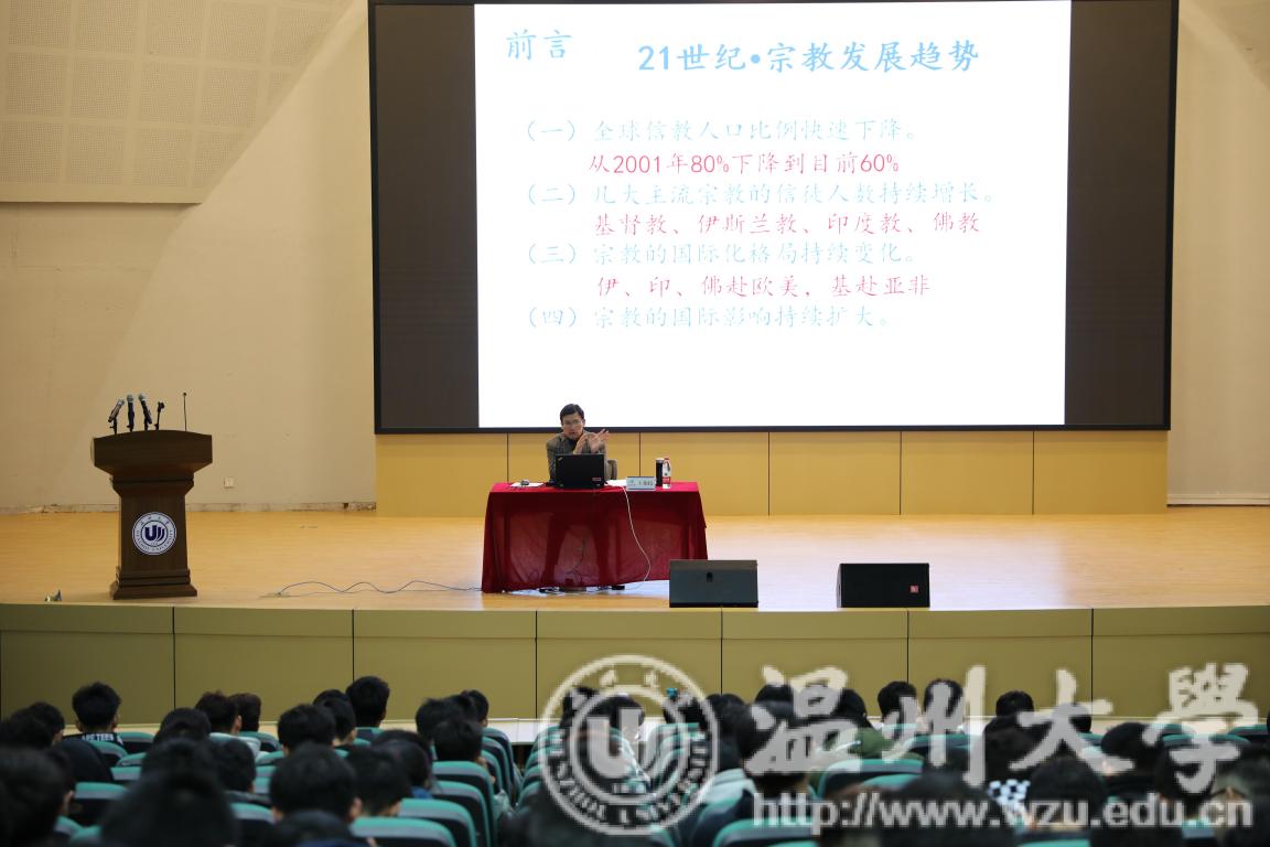 12月11日晚,本学期第一场形势与政策课讲座于南校9号楼报告厅举行。本次讲座邀请3044am永利集团3044noc马克思主义学院党总支书记王柏民担任主讲。讲座内容为马克思主义宗教观的解读。 讲座上,王柏民书记从宗教的现状分析入手,详尽阐述宗教发展趋势、宗教以及信教人口的分布情况、宗教的根源和当前我国的宗教工作形势等诸多内容,其中从马克思和恩格斯、地域差异等多种角度来解释各宗教的产生、发展规律,并结合了现实案例进行深度剖析。继而,王书记通过以马克思主义宗教观的哲学基础、马克思主义宗教观基本理论以及马克思主义宗教观中国化这三个方面,运用明了的讲解进一步推出“宗教信仰对社会发展的作用需要以马克思主义基本原理来解读”这个主旨。其次,他提到,社会主义条件下宗教作为一种社会历史文化现象,它的长期存在是一种客观现实,不以人们的主观意志为转移。马克思的宗教观对于正确把握当代宗教的发展态势具有指导意义。宗教反映现实世界,宗教也是文化现象,应积极引导宗教与社会主义社会相适应,必须始终坚持中国化的方向。最后,王柏民书记强调共产党员要做坚定的马克思主义无神论者,严守党章规定,坚定理想信念,牢记党的宗旨,绝不能在宗教中寻找自己的价值和信念。