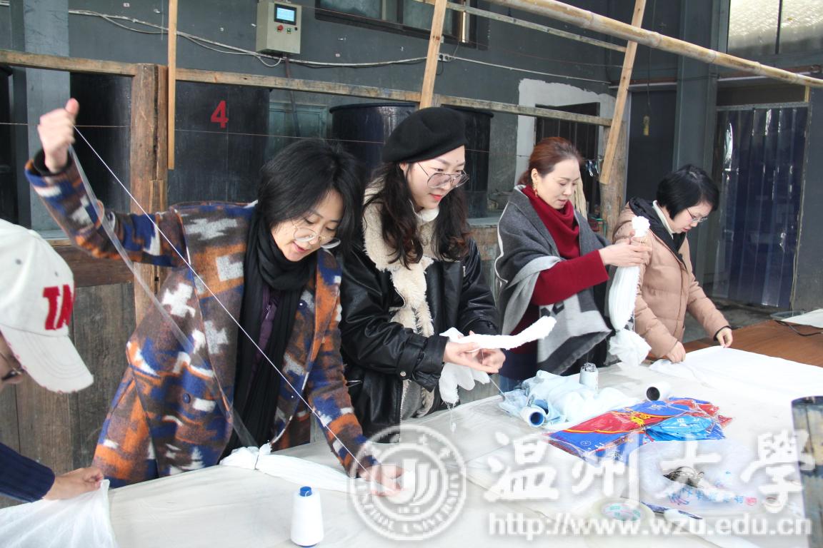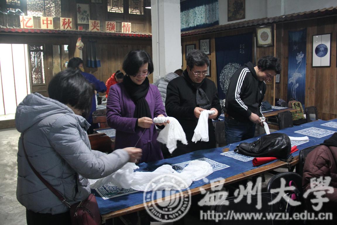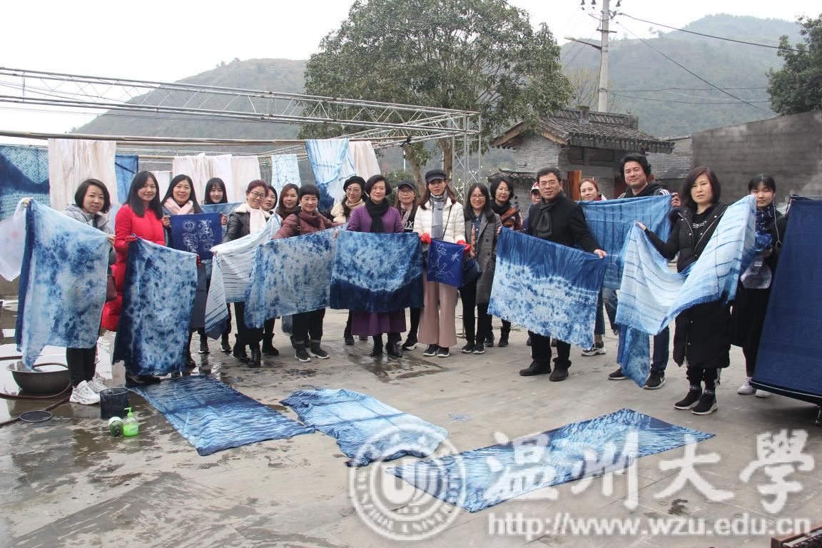 阳春三月,桃李芳菲。3044am永利集团3044noc工会组织全院女教师赴温州市采成蓝夹缬博物馆,开展世界非物质文化遗产体验活动。 乡野间桃红柳绿油菜花黄,一路上的大家因美景而兴致高昂,谈笑风生欢声笑语洒满车厢。一小时后老师们到达了位于瑞安马屿净水村附近的一幢乌瓦白墙的江南民居式建筑——温州市采成蓝夹缬博物馆。这里山环水绕茂林修竹溪流淙淙,环境十分优美。 温州蓝夹缬技艺代表性传承人、采成蓝夹缬博物馆的王河生馆长热情地到门口迎接大家。在讲堂落座后,王馆长向老师们介绍了我国夹缬印染的历史发展、原料炼制、工艺流程等知识。大家了解到:夹缬印染工艺在我国有着非常悠久的历史,早在隋唐时期彩色夹缬就已十分兴盛;宋以后由于政治经济的因素,彩色夹缬衰落而蓝夹缬一枝独秀获得了长足发展,至明清已成为相当规模的产业;民国以后由于西方工业化印染技术的传入使用天然染料的传统手工印染业陷入困境,以致前些年蓝夹缬技艺在浙南趋于消亡。在党和政府的关怀下蓝夹缬技艺被列入“国家级非物质文化遗产”得到了保护和发展。“青出于蓝而胜于蓝”的传统蓝夹缬印染技艺焕发出了新的生机。 随后在王馆长的引导和讲解下,女老师们参观了博物馆的各个展厅,从明清到当代丰富的藏品为大家呈现出一个异彩纷呈的印染艺术世界。结核自己的美术和设计专业大家纷纷与王馆长互动探讨,气氛相当热烈。之后,老师们还观摩了用木雕版印染蓝夹缬的工艺流程。 最后,为对工艺加深了解,大家亲身实践,拿出布料棉线等材料,制作扎染和蜡染作品。绑、扎、缝、叠、裹……各种技法在美院女老师的一双双巧手中纷纷上阵,创造出一个个姿态各异的布品。再在靛蓝染缸里经过“三浸染三氧化”的染蓝工序,固色漂洗后,一件件花色多变千姿百态的印蓝丝巾呈现在大家面前迎风飘扬,博物馆里院子里立刻飘起了一道靓丽的风景线。老师们站在晾架前面对着各自创造的作品交流着心得体会,欢声笑语阵阵不断。 短短半日,老师们沉浸于传统染缬文化传递的历史美,在这盎然春日,至真至美的地方传统文化再次在寻访之人心中生根发芽,并将年复一年绽放于教书育人的一言一行。(文/图冀千里)