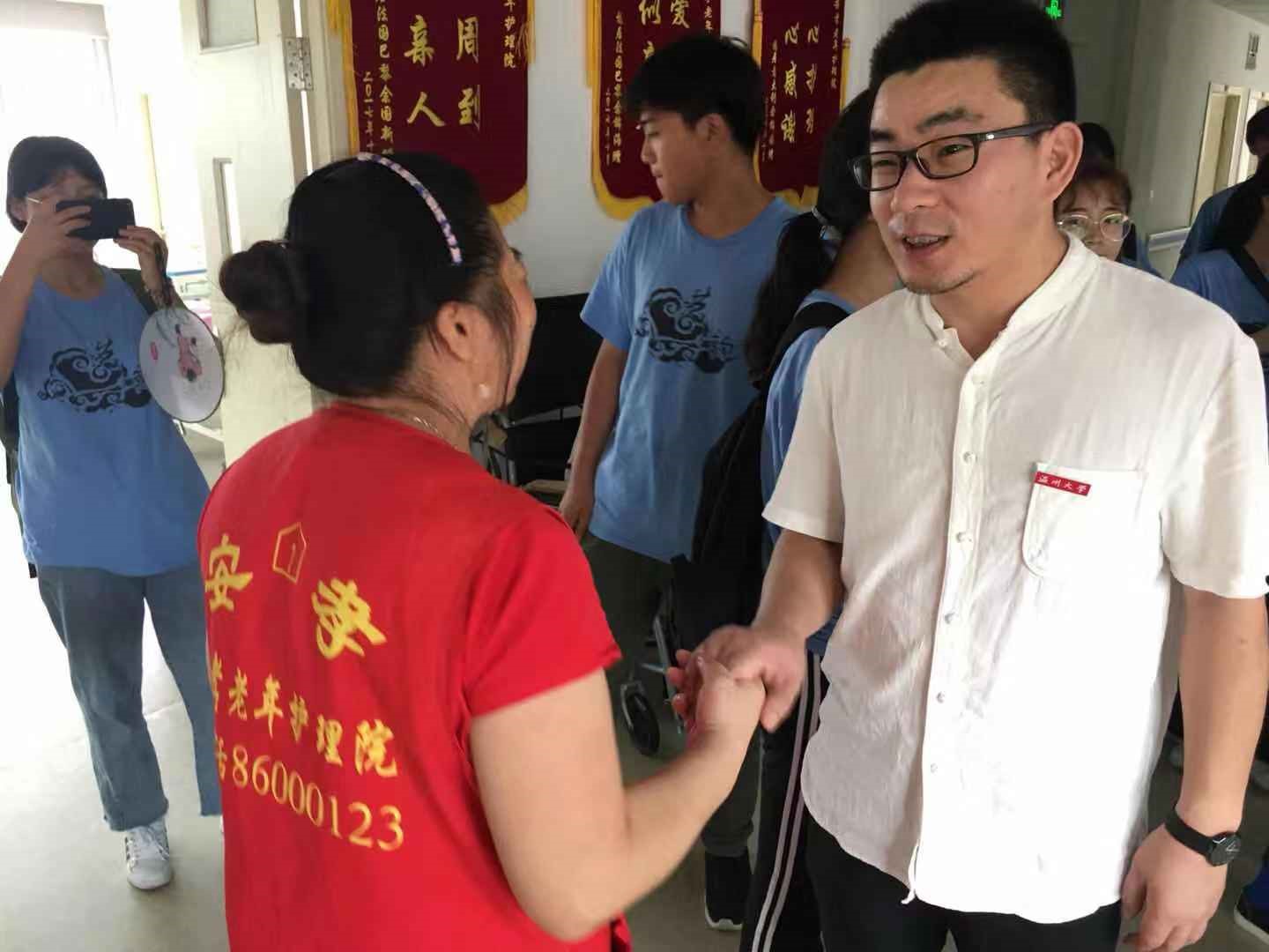 3044am永利集团3044noc“艺韵晚霞”实践队由美院、机电学院、人文学院等学生组成,共有21名队员,实践队坚持走出校门、深入基层,以接触社会、了解社会、服务社会为主要内容,前期通过探访、宣传、切身体验非遗等形式开展实践活动,来进一步加强对优秀传统文化的认识。后期通过为老人开展志愿者服务的实践活动,加强大学生思想道德修养,培养大学生奉献精神和实践能力。 2019年7月18日上午九时许,3044am永利集团3044noc副院长胡文超慰问了正在温州安孝老年护理院关爱老人活动的“艺韵晚霞”暑期社会实践队。初到敬老院,胡院长一行受到实践队员的热情欢迎,通过和队员们简单的交谈后,胡院长进入敬老院里,和敬老院里的护理人员详细了解敬老院的基本情况。 由于二楼的老人在睡觉,胡院长分别看望慰问了一楼和三楼的老人。看到队员们和一些可以表达的老人聊家常,胡院长也饶有兴趣的和老人交谈,关心他们日常的生活。老人们也很愿意和队员们聊天,一位老人聊自己的子女,满满的自豪感,讲到自己的子孙在国外,之前家里给请保姆,不过照顾不好,所以来了这里。还有位很和蔼的老奶奶,一直笑着,还很亲切的关心我们,问我们吃饭了没。还有一些队员给手脚不好的老爷爷按摩搓手,一位老爷爷有中风,护理阿姨做了拉伸运动后,老爷爷痛得捂着手,队员们见状便给老爷爷搓搓手,缓解疼痛。实践队员们一边关心老人,一边也把自己做的扇子送给老人,聊表心意。 胡院长对实践队的实践工作表示充分肯定,并真切叮嘱,要敞开心扉和老人们交流,我们每个人都会有老去的一天,我们应该怀着一份真诚的孝心去倾听,在实践活动中为老人和社会服务,让自己进步,并鼓励大家继续努力,把握好剩余几天的实践光阴,长见识增才干。 胡院长的话令实践队员们受益颇多,也给队员们带来了极大的精神鼓舞,让队员们更深刻地体会实践的意义所在。骄阳七月,实践队员们也希望在炎热的夏日,为老人们闷躁的生活带来一丝惬意。老人需要更多陪伴和关怀,希望通过此次活动,更好的唤醒社会敬老爱老的意识,弘扬尊老敬老的传统美德。