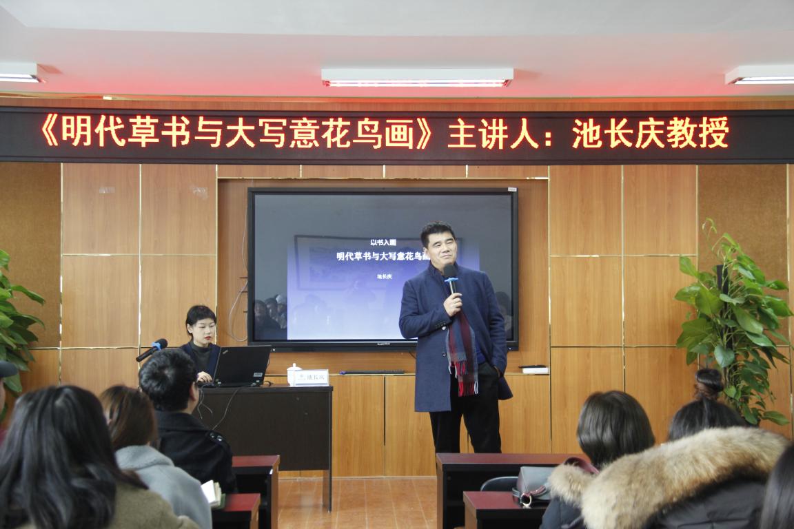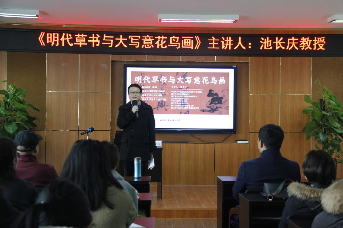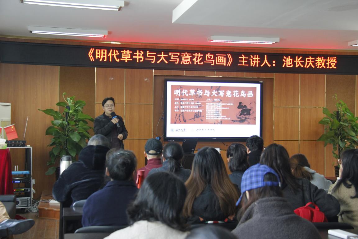 1月2日下午,永利集团官网荣幸邀请到浙江大学中国艺术研究所执行所长、艺术创作研究中心主任池长庆教授,为永利集团官网师生带来一场题为《明代草书与大写意花鸟画》的讲座。学院院长谢子静、副院长顾任飞、美术系专业老师,研究生、本科生及温州书法爱好者共80多人参加活动,丁海涵副教授担任学术主持。