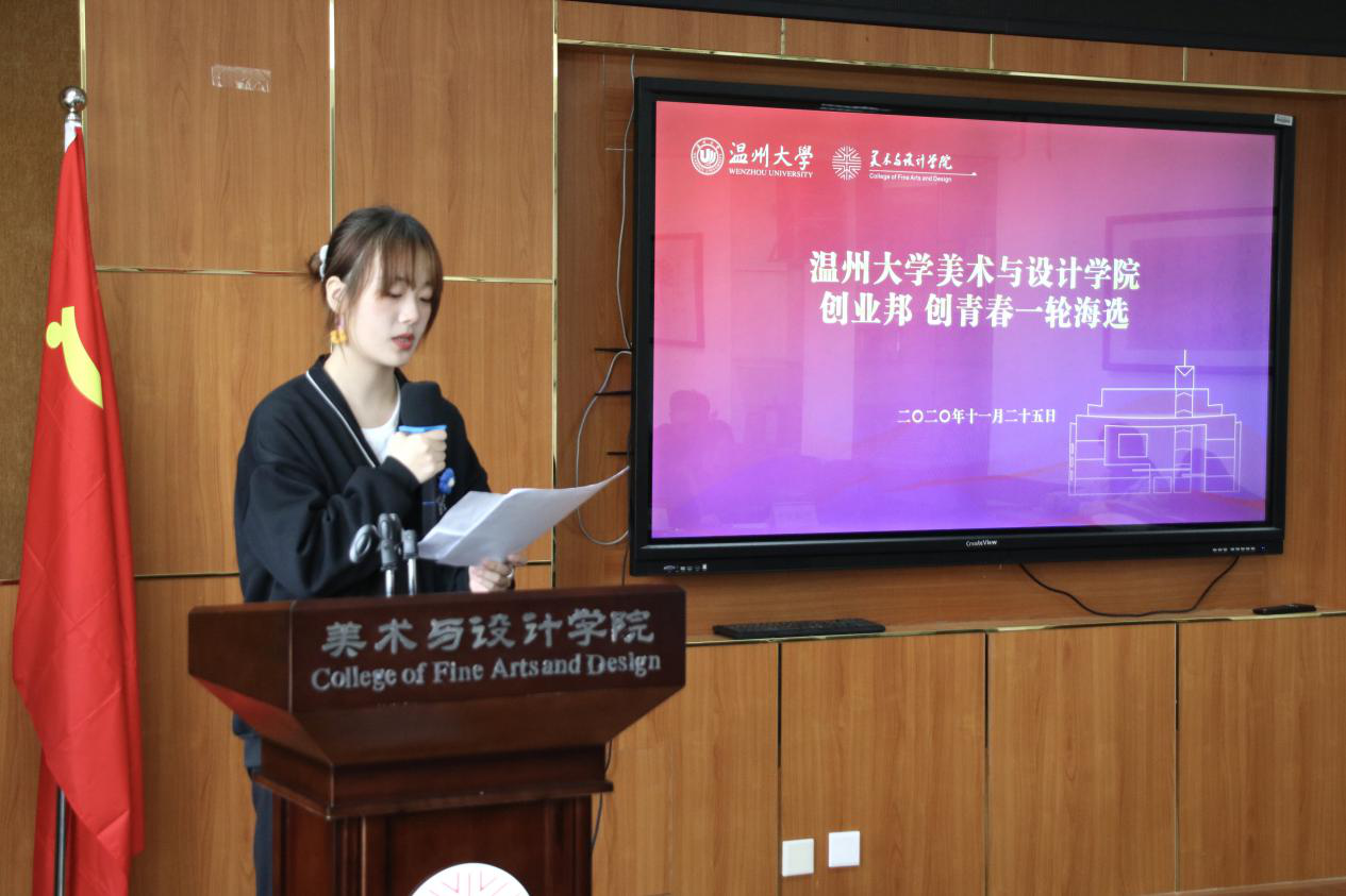 2020年11月25日下午一点半,3044am永利集团3044noc于美院2b4001举行了2020创业邦·创青春主题活动的一轮海选。此次活动由美院团委学生会主席、三届创业邦举办者邱懋澄学长、温大创盟创业创新宣传部部长彭左炎学长、温大创业协会会长、美院KAKAYOUGA手工艺工作室蒋丽华学姐、美院团委学生会创业就业部部长、温大创业协会副会长连庆秋、美院团委学生会创业就业部部长、20203044am永利集团3044noc互联网+创业创新大赛金奖王臻滢学姐担任评委。此次活动有助于加强温大学生创业技能的学习并且注重大学生创业意志的培养,引导温大人有创新有大胆的同时,深究项目的可行性。