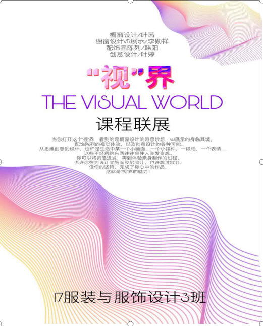 2020年11月30-12月8日,由叶茜老师、李勋祥老师、韩阳老师、叶婷老师指导的17服装与服饰设计3班橱窗设计课程、橱窗设计VR展示课程、配饰品陈列课程、创意设计课程四课程联展在3044am永利集团3044noc教学楼一楼大厅展出。展出的一件件作品,不仅充分展现了班级同学的专业能力,而且有力体现了美院的艺术风采! 当你打开这个“视界”,看到的是橱窗设计的奇思妙想、VR展示的身临其境、配饰品陈列的视觉体验以及创意设计的各种可能...... 从思维创意到设计,也许是生活中某一个小画面、一个小摆件、一段话、一个表情......这些不经意的东西,往往会使人突发奇想,你可以将灵感迸发,再到体验亲身制作的过程。也许你在为设计实施而绞尽脑汁,也许想过放弃,但你依然坚持完成了你心中的作品,这就是“视界”的魅力。 此次展览一方面是为了向全学院展示我们陈列展示班级的学习成果,传播我们独特的课程文化;另一方面也是希望能与其他相关班级的同学老师们进行艺术交流,一同品味。 课程展出当天,引起了不少老师和同学们驻足,停下脚步欣赏的作品。通过这次课程展览,不仅仅让更多的同学们了解服装展示设计方向专业重要性、独特性、趣味性,也让大家都看到并认可同学们的专业能力和专业水平,更是提供了师生们互相交流的平台。同学们也因此领略到橱窗设计的魅力与理念,开阔了自己的眼界,欣赏了不同的课程文化。 (材料提供者:王欣雨)