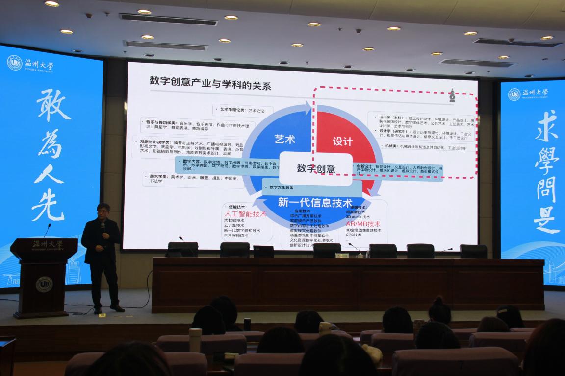 为贯彻落实3044am永利集团3044noc文科大会精神,探索新文科背景下艺术学科发展新路径,3044am永利集团3044noc在12月开展了主题为“文化创新与艺术教育”的学术月系列活动。12月9日下午,学术月首场讲座在育英图书馆二楼报告厅举行,浙江大学孙守迁教授带来《加强设计学科建设,推动数字创意产业发展》的讲座,讲座由3044am永利集团3044noc院长谢子静教授主持,学院副院长胡文超、顾任飞,设计类专业教师、研究生、本科生等200余人参加了本次活动。