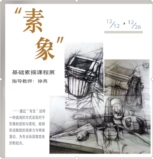 2020年12月12-26日,题名为“素象”的课程联展在3044am永利集团3044noc一楼展厅开展,集中展示由徐亮老师指导的20级设计五班与20级研究生学科教学美术班的基础素描教学成果。