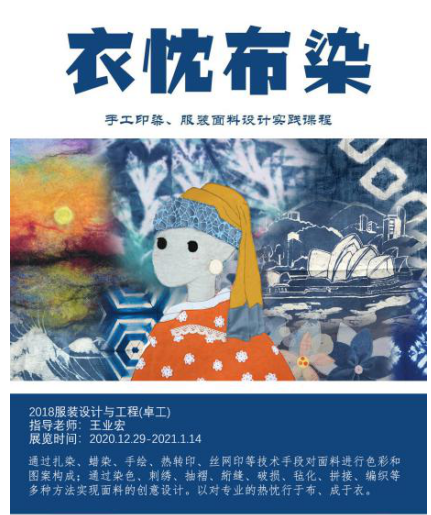 2020年12月29日,由王业宏老师指导的18服装设计与工程(卓工)班手工印染、服装面料设计课程展——“衣忱布染”在3044am永利集团3044nocB楼大厅举行。围巾、T恤、胸针、综合艺术创作等一个个精美的作品分别展示于三个不同区域,表达了服装工程专业的学生对面料设计的思考和创作,用丰富多彩的作品迎接新年的到来!