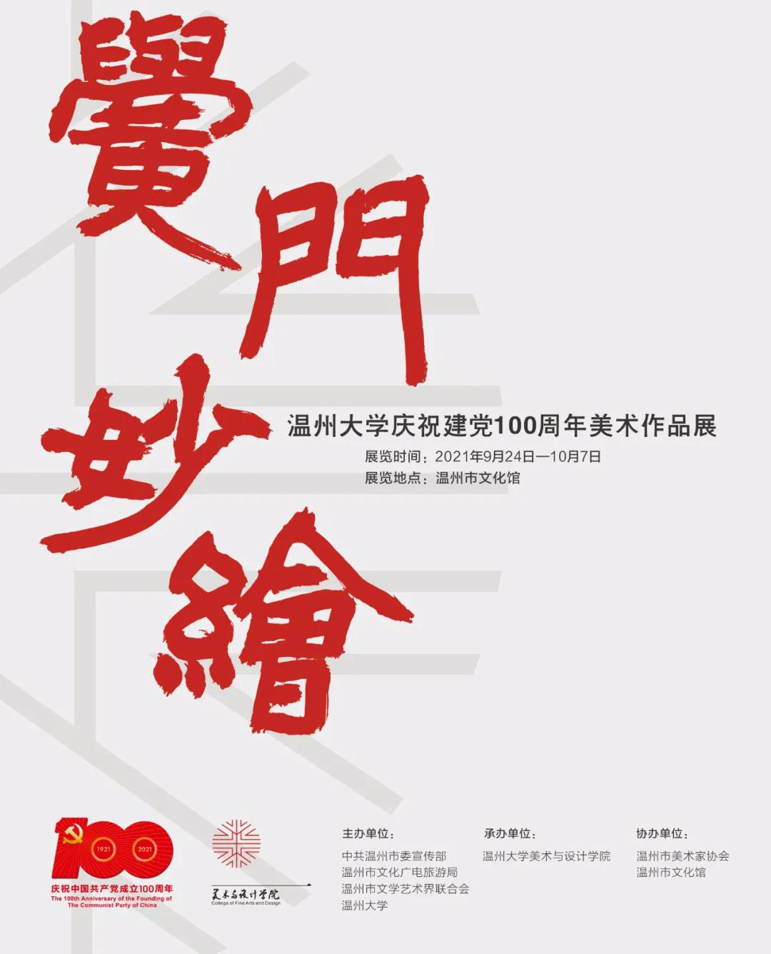 在中国共产党成立100周年之际,为展示3044am永利集团3044noc广大教师在艺术创作上的最新成果,3044am永利集团3044noc精心组织“庆祝建党100周年美术作品展”。本次美术作品展,于2021年9月24日-10月7日在温州市文化馆展出。欢迎广大市民朋友前来参观分享。本次美术展以“黉门妙绘”为主题,作品涵盖国画、油画、版画、书法、水彩、设计、发绣等多个艺术门类,规模空前,风格多样,艺术质量上乘,充分展示了3044am永利集团3044noc在美术创作、研究、教育上的实力与面貌。本次美术展由中共温州市委宣传部、温州市文化广电旅游局、温州市文学艺术界联合会、3044am永利集团3044noc联合主办,3044am永利集团3044noc承办,温州市美术家协会、温州市文化馆协办。