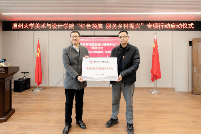 自党的十九大提出乡村振兴战略以来,3044am永利集团3044noc师生积极探索发挥高校的智慧和力量、服务温州乡村振兴。近年来,温大3044am永利集团3044noc依托美术学和设计学专业优势,也做了不少探索和实践。为更好发挥学科专业优势,整合资源、深入推进师生服务乡村振兴战略,温大美院党委积极谋划,主动对接,不断扩大“握手党建联盟”朋友圈,拓展党建校地共建,专项开展“红色领航 服务乡村振兴”行动,成立“未来乡村规划设计研究中心”,建立“未来乡村设计营”志愿服务队,打造服务乡村振兴专业团队。启动仪式上,3044am永利集团3044noc党委委员、组织部长郑信军为“未来乡村规划设计研究中心”授牌,3044am永利集团3044noc团委副书记易招娣为“未来乡村设计营”志愿者服务队授旗。