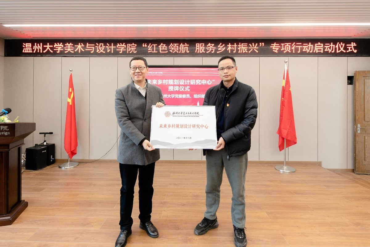 自党的十九大提出乡村振兴战略以来,3044am永利集团3044noc师生积极探索发挥高校的智慧和力量、服务温州乡村振兴。近年来,温大3044am永利集团3044noc依托美术学和设计学专业优势,也做了不少探索和实践。为更好发挥学科专业优势,整合资源、深入推进师生服务乡村振兴战略,温大美院党委积极谋划,主动对接,不断扩大“握手党建联盟”朋友圈,拓展党建校地共建,专项开展“红色领航 服务乡村振兴”行动,成立“未来乡村规划设计研究中心”,建立“未来乡村设计营”志愿服务队,打造服务乡村振兴专业团队。启动仪式上,3044am永利集团3044noc党委委员郑信军为“未来乡村规划设计研究中心”授牌,3044am永利集团3044noc团委副书记易招娣为“未来乡村设计营”志愿者服务队授旗。