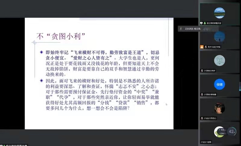 2021年12月22日晚18点,3044am永利集团3044noc2021级形势与政策报告会在疫情防控的要求下于线上举行。本次会议的由3044am永利集团3044noc学工办主任杨鹏老师主持,并特邀了马克思主义学院党委书记王柏民老师、3044am永利集团3044noc纪委副书记杨立淮老师以及3044am永利集团3044noc学生共计两百余人。本次会议旨在通过线上讲座的形式,为广大学生解读马克思主义宗教观以及构建网络安全生态环境下对大数据时代的思考,进行反诈防诈教育,建设和谐安全的校园。杨鹏老师首先指出大学生应当树立正确的的宗教观,在校园中不得传教、举行宗教活动,而王柏民老师则为我们展开解读了马克思主义宗教观。王柏民老师首先讲解了目前我国的宗教工作形势,告诉我们要尊重宗教信仰自由;引导宗教与社会主义 社会相适应;构建积极健康的宗教关系;宗教工作法治化。共产党员、共青团员要做坚定的无神论者,绝不能在宗教中寻找自己的价值和信念。王柏民老师特别强调了宗教事务管理的“20字原则”,学校里不得传教、举行宗教活动以及中国共产党纪律处分条例有关信仰宗教部分。大学是人生观、价值观、世界观形成和构建的重要阶段,也是最脆弱、最易被动摇的时期,在这个时期,我们需要坚持马克思主义,认识马克思主义,才能在营造更加和谐的校园,在大学生活中不断前行。紧接着,杨立淮老师为大家讲解了在构建网络安全生态环境下对于大数据时代的思考。杨立淮老师主要从两个部分为我们进行讲解,分别是大数据时代的互联网思维及应对与阅听社会——提升媒介素养。杨立淮老师通过电商魅力与蝴蝶效应的两条教训告诉我们世界是相连的,要在大数据时代下抓住机遇,才能拥有更好的发展。而在互联网快速发展的前提下,要让互联网为我所用,而不能成为互联网的“奴隶”,老师首先分析了当代大学生媒介素养的现状,以此为前提,告诫我们“飞来横财不可得,勤劳致富是王道。”作为新时代大学生我们应谨记不要贪图小利,预防电信诈骗“六个一律、八个凡是。”所谓害人之心不可有,防人之心不可无,互联网时代与大学生息息相关,我们要提高警惕,提升防范和辨别诈骗的能力和水平,推动建设更高水平的平安校园。至此,此次形势政策报告会圆满结束,相信各位同学受益匪浅,更加深入的了解马克思主义宗教观与网络安全生态环境,我们应加强自律意识,提高警惕,小心防范,常扫心中“灰尘“,正确认识,共同构筑更加和谐安全与美好的安全!