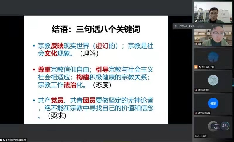 2021年12月22日晚18点,3044am永利集团3044noc2021级形势与政策报告会在疫情防控的要求下于线上举行。本次会议的由3044am永利集团3044noc学工办主任杨鹏老师主持,并特邀了马克思主义学院党委书记王柏民老师、3044am永利集团3044noc纪委副书记杨立淮老师以及3044am永利集团3044noc学生共计两百余人。本次会议旨在通过线上讲座的形式,为广大学生解读马克思主义宗教观以及构建网络安全生态环境下对大数据时代的思考,进行反诈防诈教育,建设和谐安全的校园。