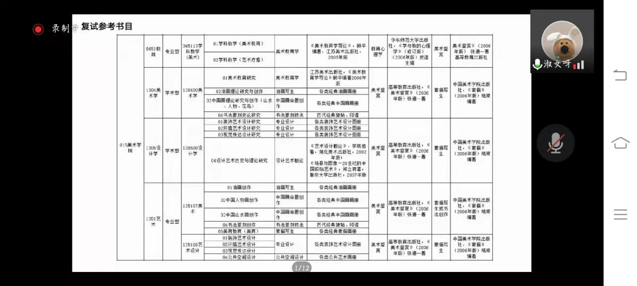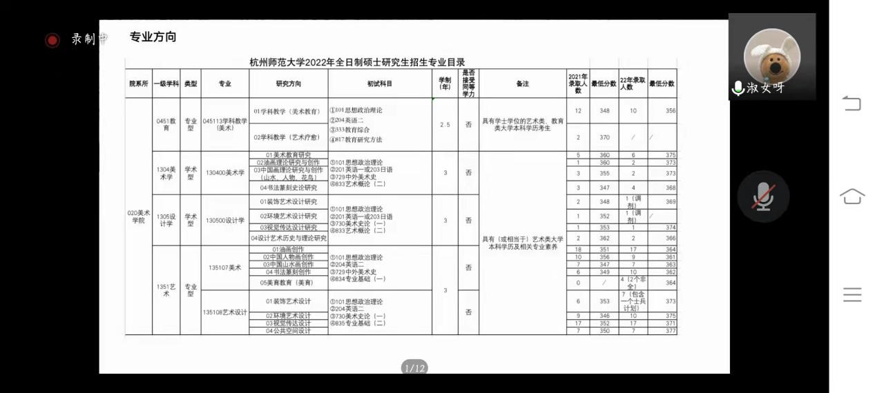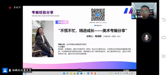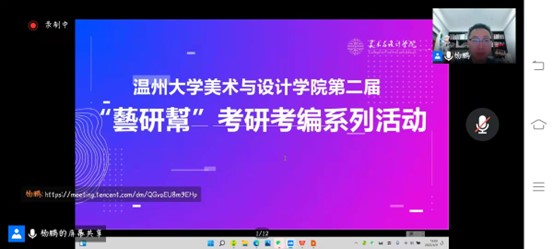 2022年6月9日晚上6点,3044am永利集团3044noc第二届“藝研幇”考研考编系列活动如期开展,本期活动邀请了两位成功上岸学姐来为我们进行考研考编经验分享,活动由学工办主任杨鹏老师主持。 首先是陈佳群学姐分享,她是温大美术学专业2022届毕业生,现已考取台州市黄岩区编制美术教师,她分享的是自己考编的经验。 陈学姐先简单向我们介绍了一般师范生的毕业去向,再从储备应考资本、关注招考动态、了解招考程序、如何提高上课能力和劳逸结合这五个方面向我们分享自己的考编技巧。 对于了解招考程序这一块,陈学姐非常全面的从笔试面试和所报地区或单位的历年招聘情况三方面进行讲解。让众多大一大二学生提前了解了这方面的知识,受益匪浅。也让准备考研的同学们的思维脉络更加清晰。在学习之余,陈学姐鼓励大家要懂得劳逸结合,休息是为了更好的前行,有质量的放松是非常重要的,而不是两点一线,这样的人生失去了意义。所以无论如何,要记得休息,审视自己,每天给自己安排一个合理的放松时间,给心灵来一次放松,这才是真正意义上的劳逸结合。最后陈学姐还分享了自己关于大学生活和工作的看法。 而接下来的张淑颖学姐则分享的是自己的考研经验,张淑颖学姐是杭州师范大学2020级艺术设计在读研究生。 张学姐详细的为我们讲解了考杭州师范大学美院需要知道的一些具体情况。考前要通过研招网和院校官网以及与学长学姐沟通等方式综合比较确定自己的目标院校和专业。 随后学姐还推荐了众多复试的参考书目,信息很全面。 张学姐还给我们分享了自己的美术史论的学习技巧,要做好合理的规划和历年真题的研究,要学会整理书本重点理清答题思路与技巧。 最后,杨老师对本次分享会进行了总结,同时也回答了一些备考生关注的问题,让大家对于考研考编的认识更深入了一层。
