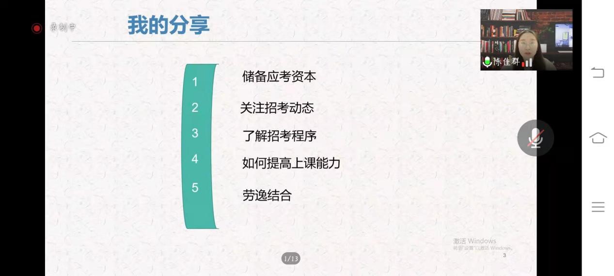 陈学姐先简单向我们介绍了一般师范生的毕业去向,再从储备应考资本、关注招考动态、了解招考程序、如何提高上课能力和劳逸结合这五个方面向我们分享自己的考编技巧。